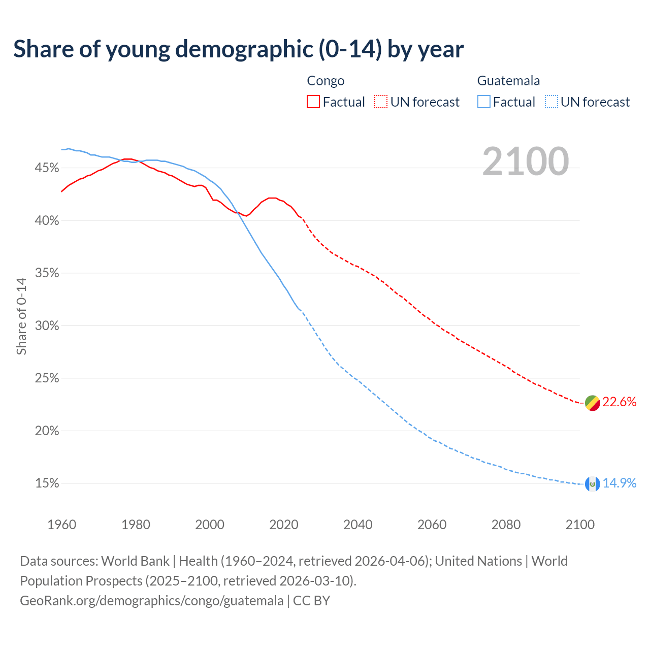 - The share of young demographic (0-15 years old) in the Congo is 40.4% vs 31.6% in Guatemala.