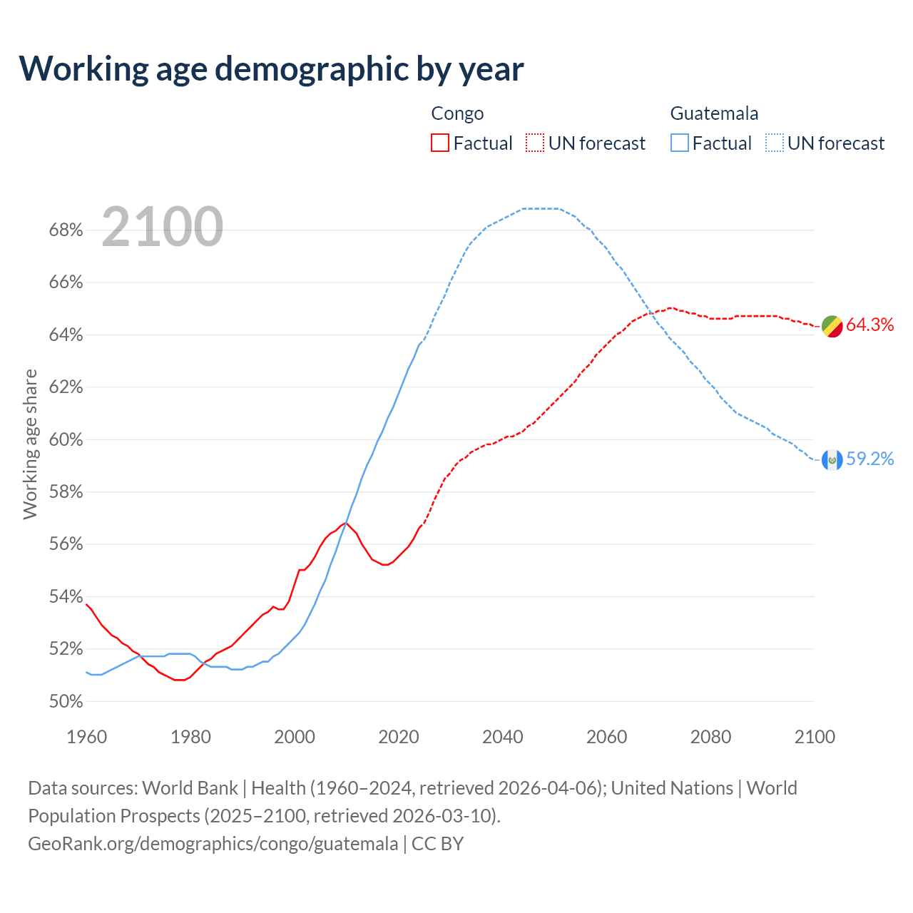 - The Congo has 3.78M working age adults (aged 15-64) vs 12.1M in Guatemala.