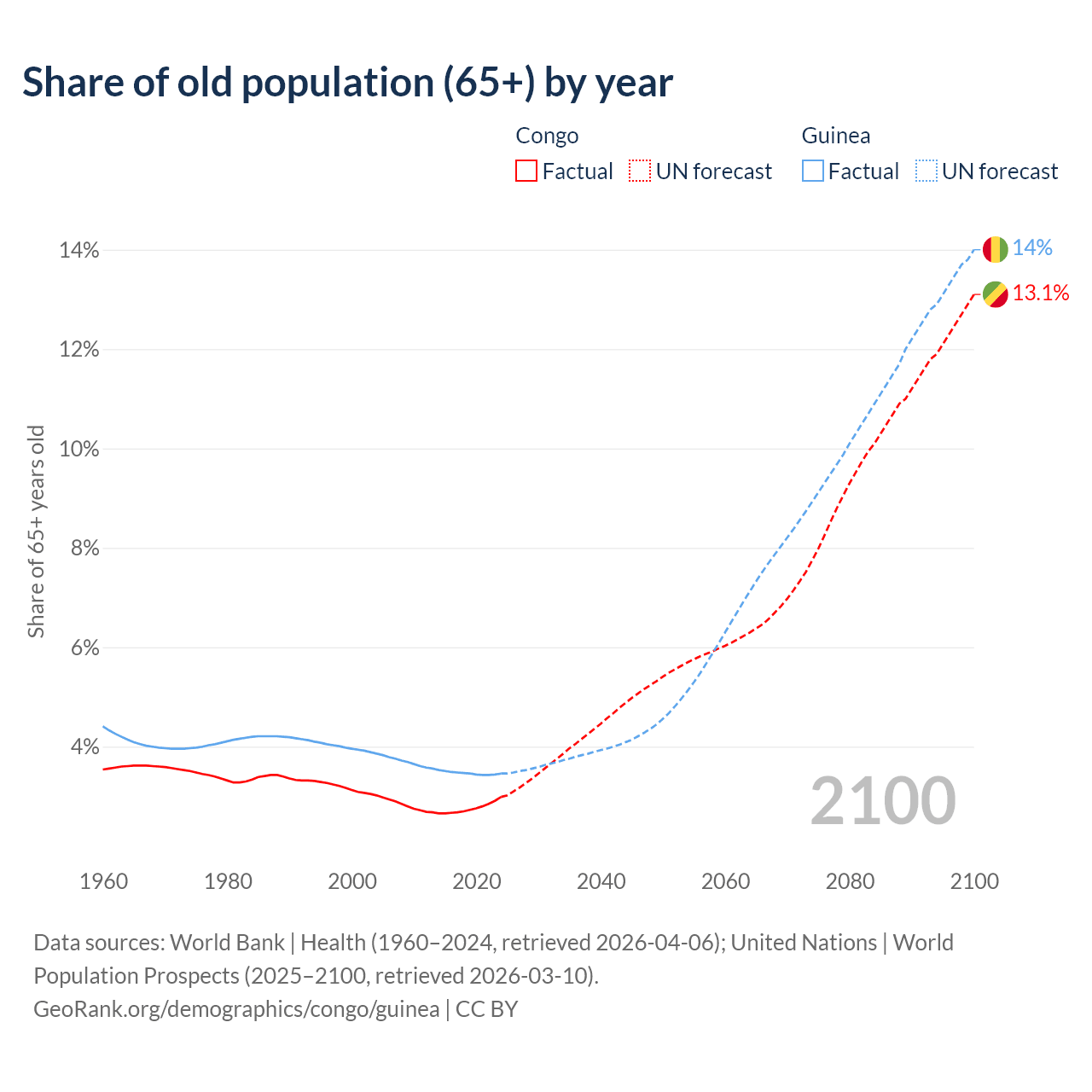- The share of old-age demographic (65+) in the Congo is 2.99% vs 3.46% in Guinea.