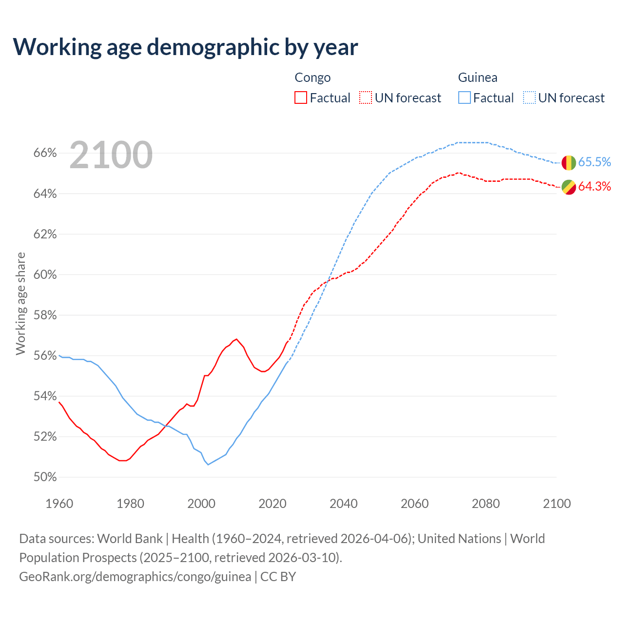 - The Congo has 3.78M working age adults (aged 15-64) vs 8.65M in Guinea.