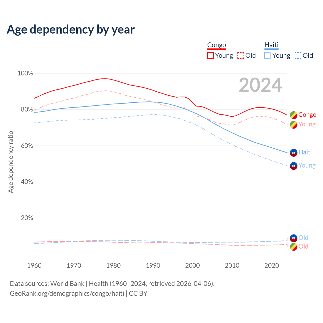 - The share of old-age demographic (65+) in the Congo is 2.99% vs 4.71% in Haiti.