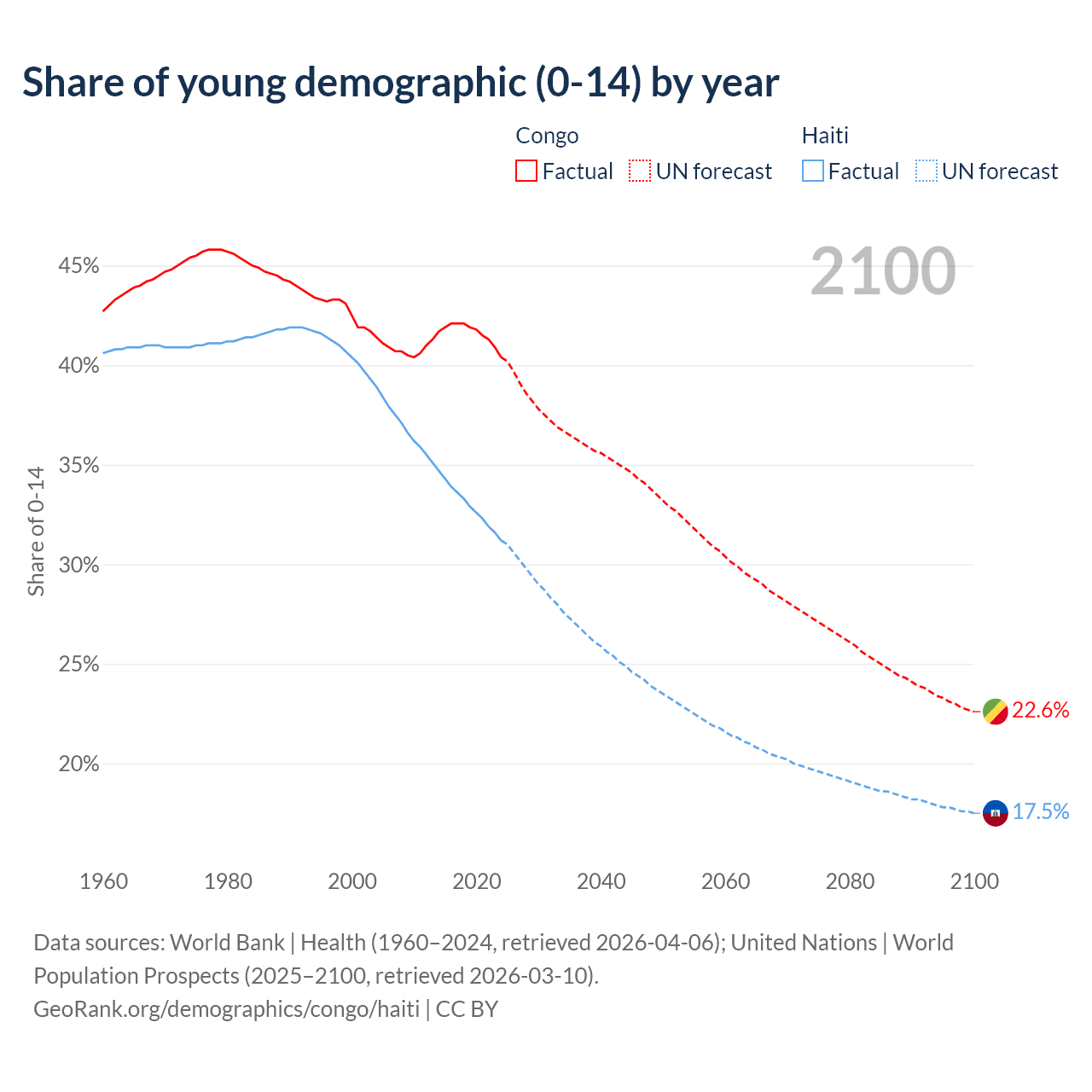- The share of young demographic (0-15 years old) in the Congo is 40.4% vs 31.2% in Haiti.