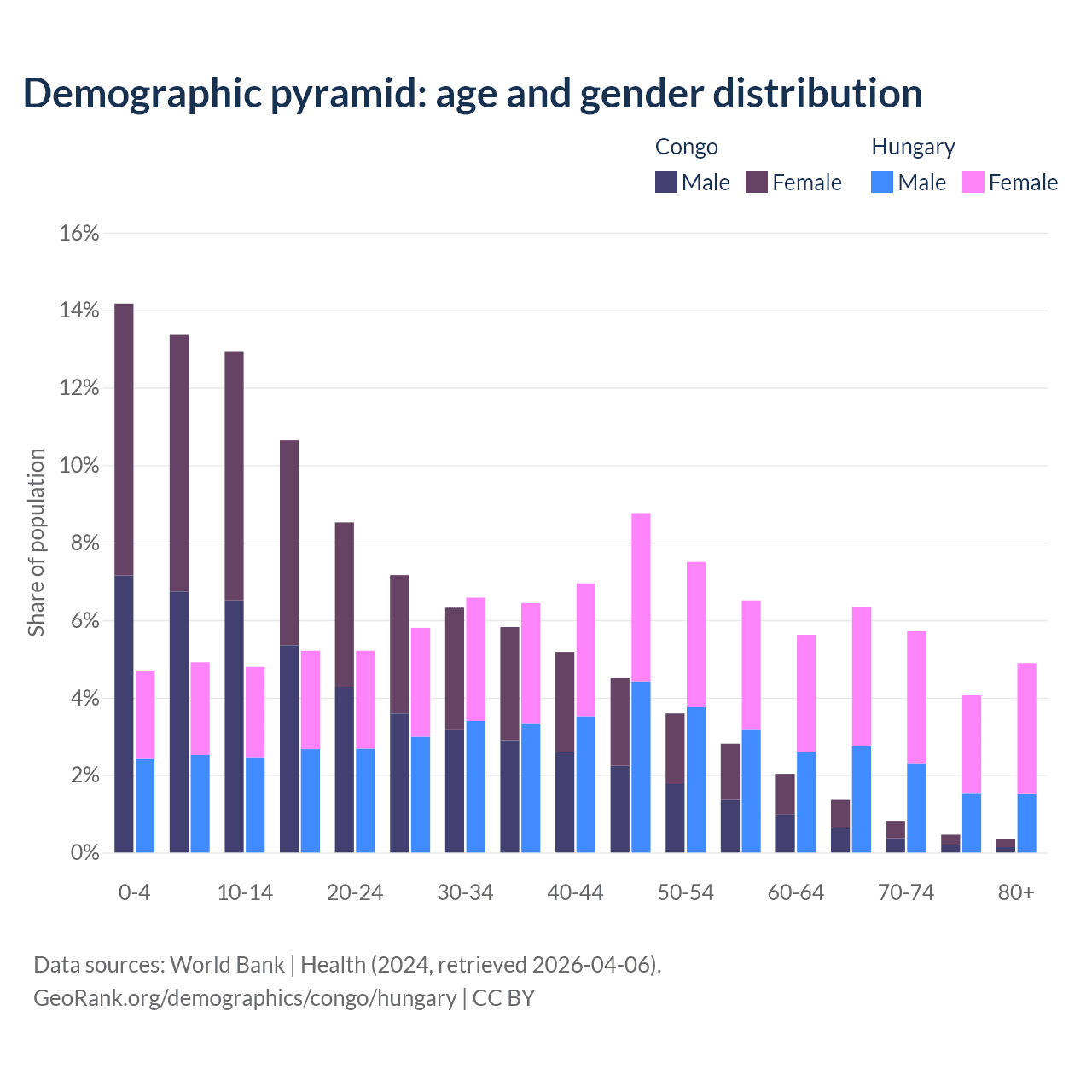 - The share of young demographic (0-15 years old) in the Congo is 40.4% vs 14.4% in Hungary.