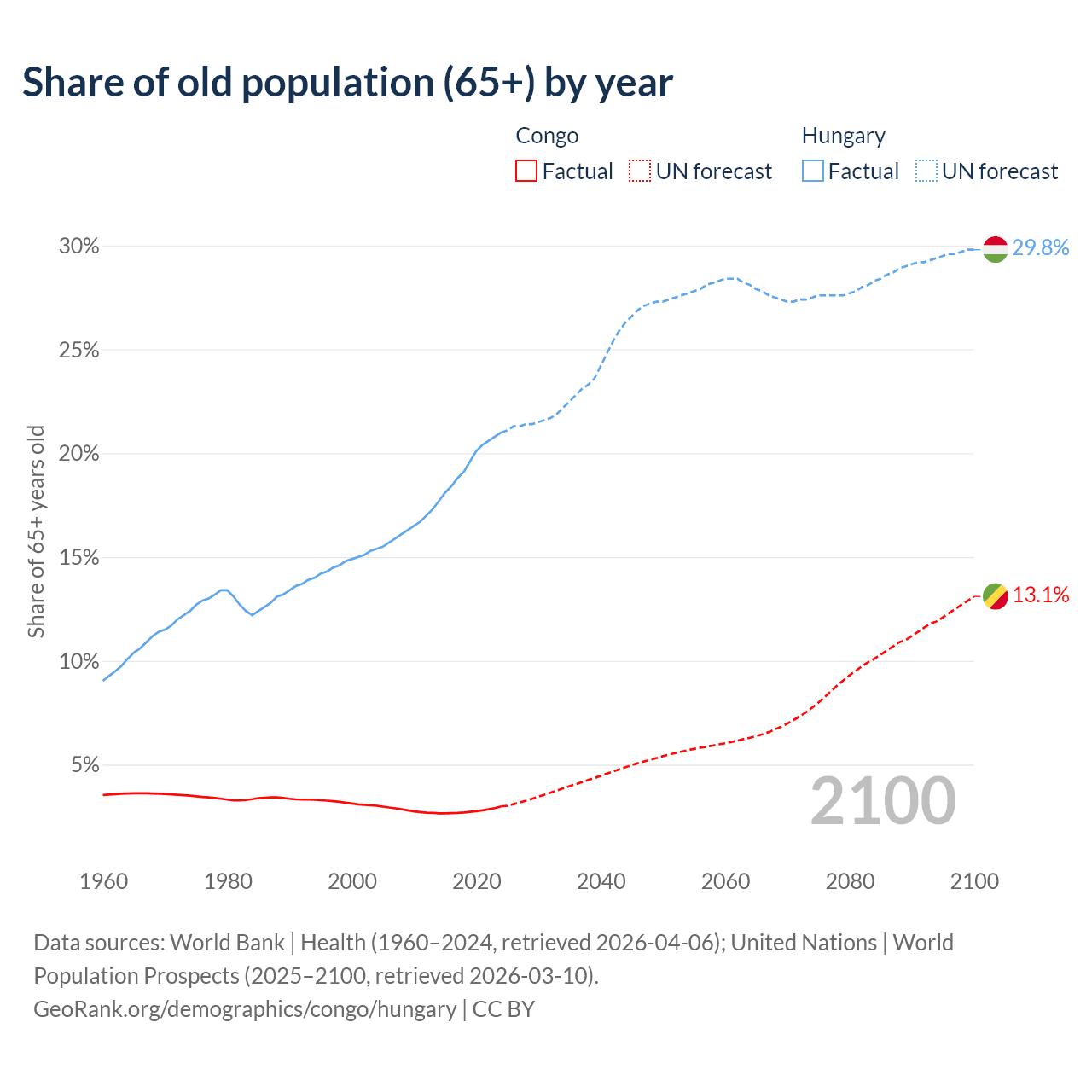The share of older people aged 65 and over is 2.99% in the Congo and 21% in Hungary. Life expectancy in the Congo compared to Hungary .