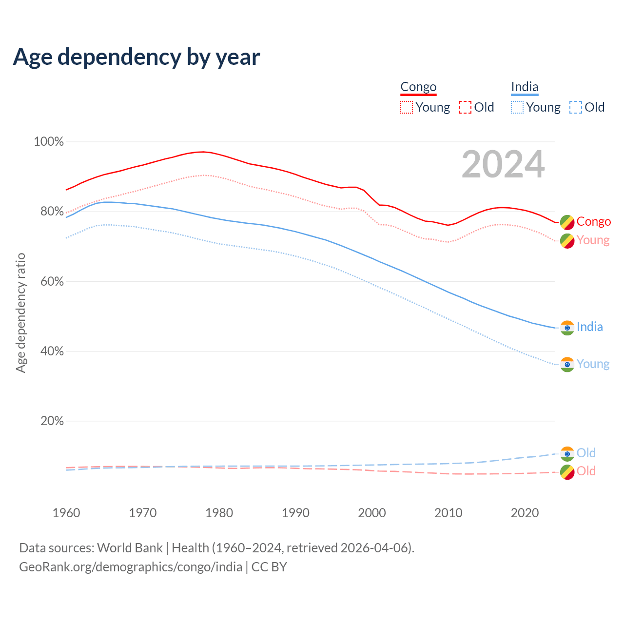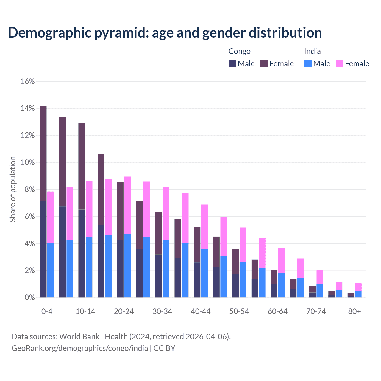 - The Congo is ranked 170/196 by median age (oldest to youngest) vs 108/196 for India.