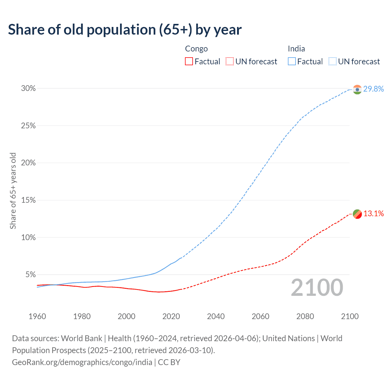 - The share of old-age demographic (65+) in the Congo is 2.99% vs 7.15% in India.