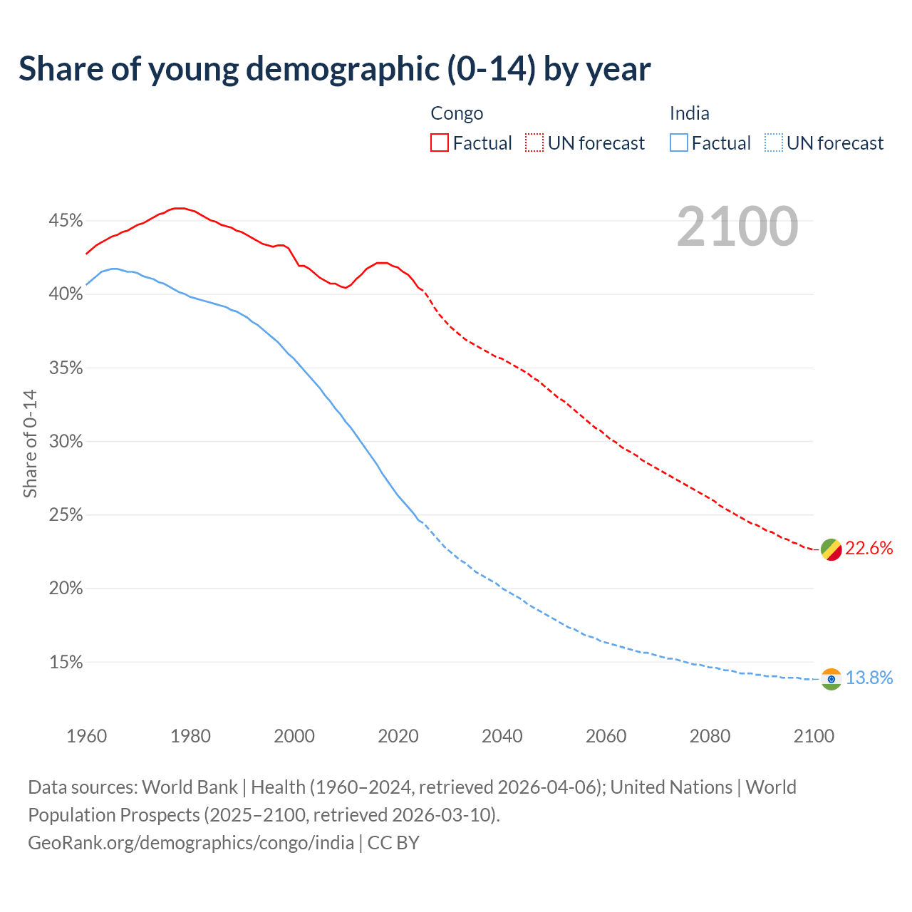 - The share of young demographic (0-15 years old) in the Congo is 40.4% vs 24.6% in India.