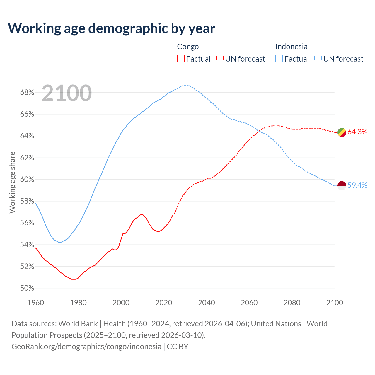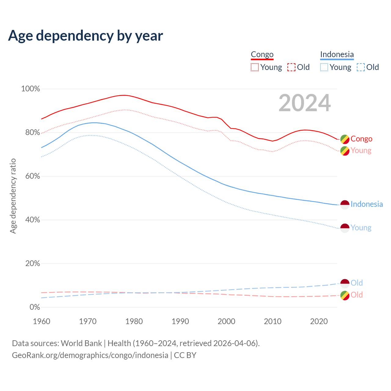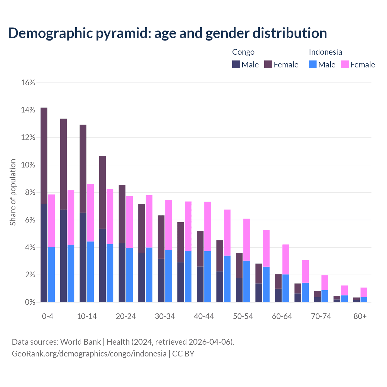 - The share of old-age demographic (65+) in the Congo is 2.99% vs 7.29% in Indonesia.