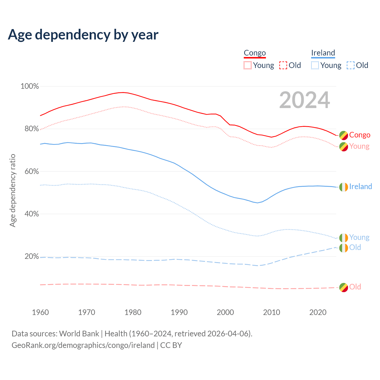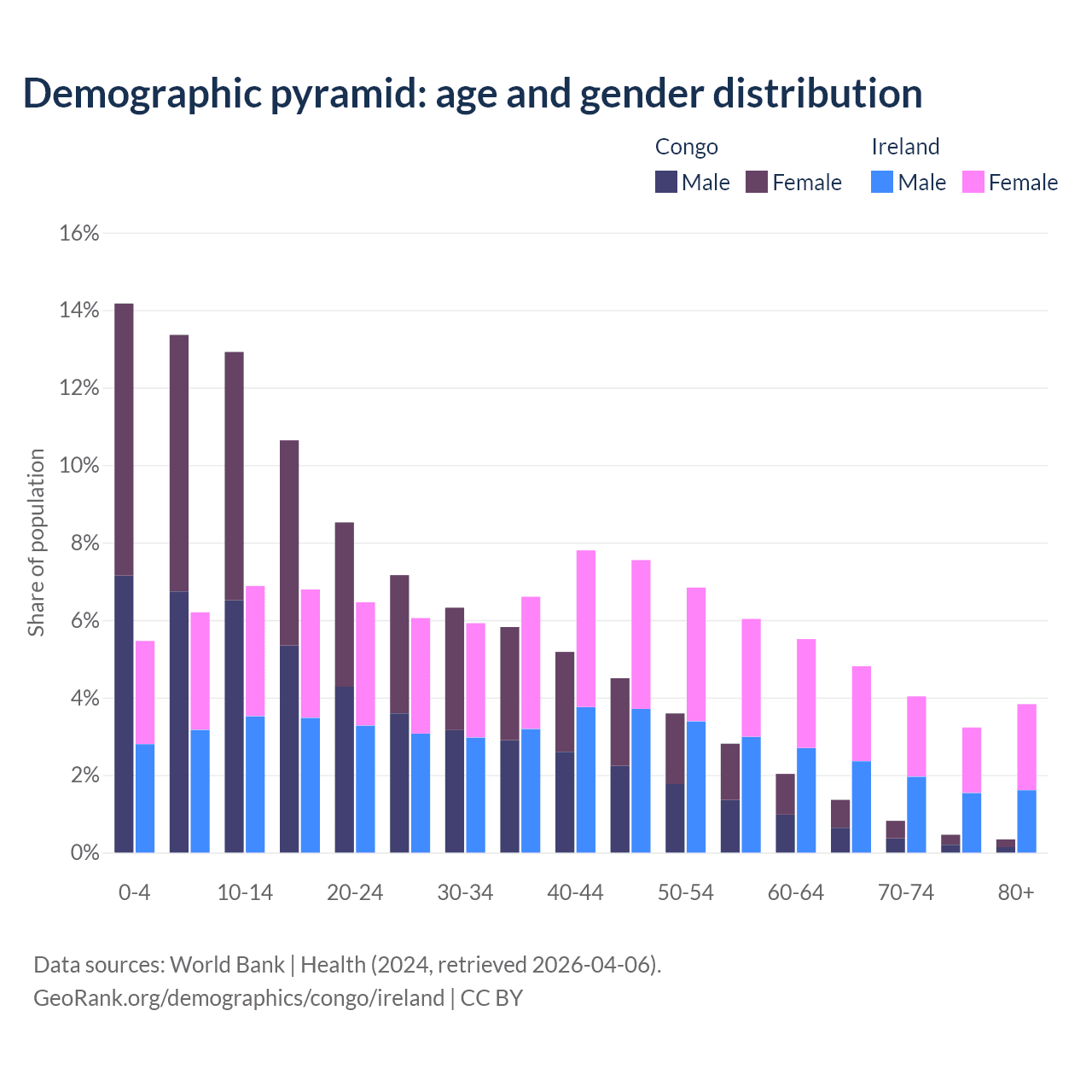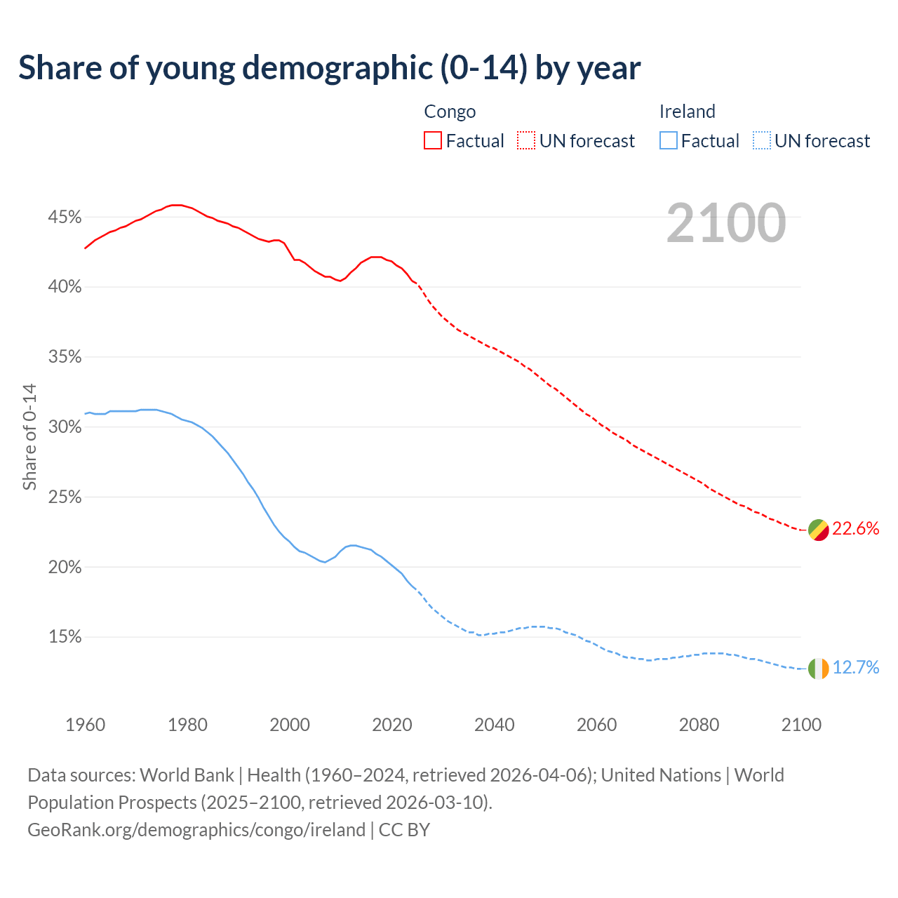 - The share of young demographic (0-15 years old) in the Congo is 40.4% vs 18.6% in Ireland.