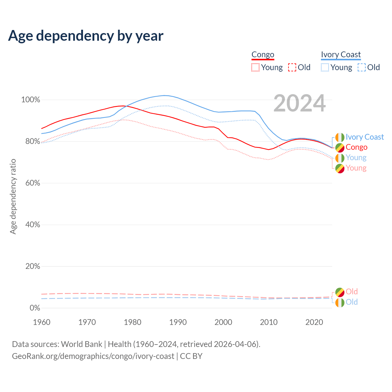 - The share of old-age demographic (65+) in the Congo is 2.99% vs 2.61% in Ivory Coast.