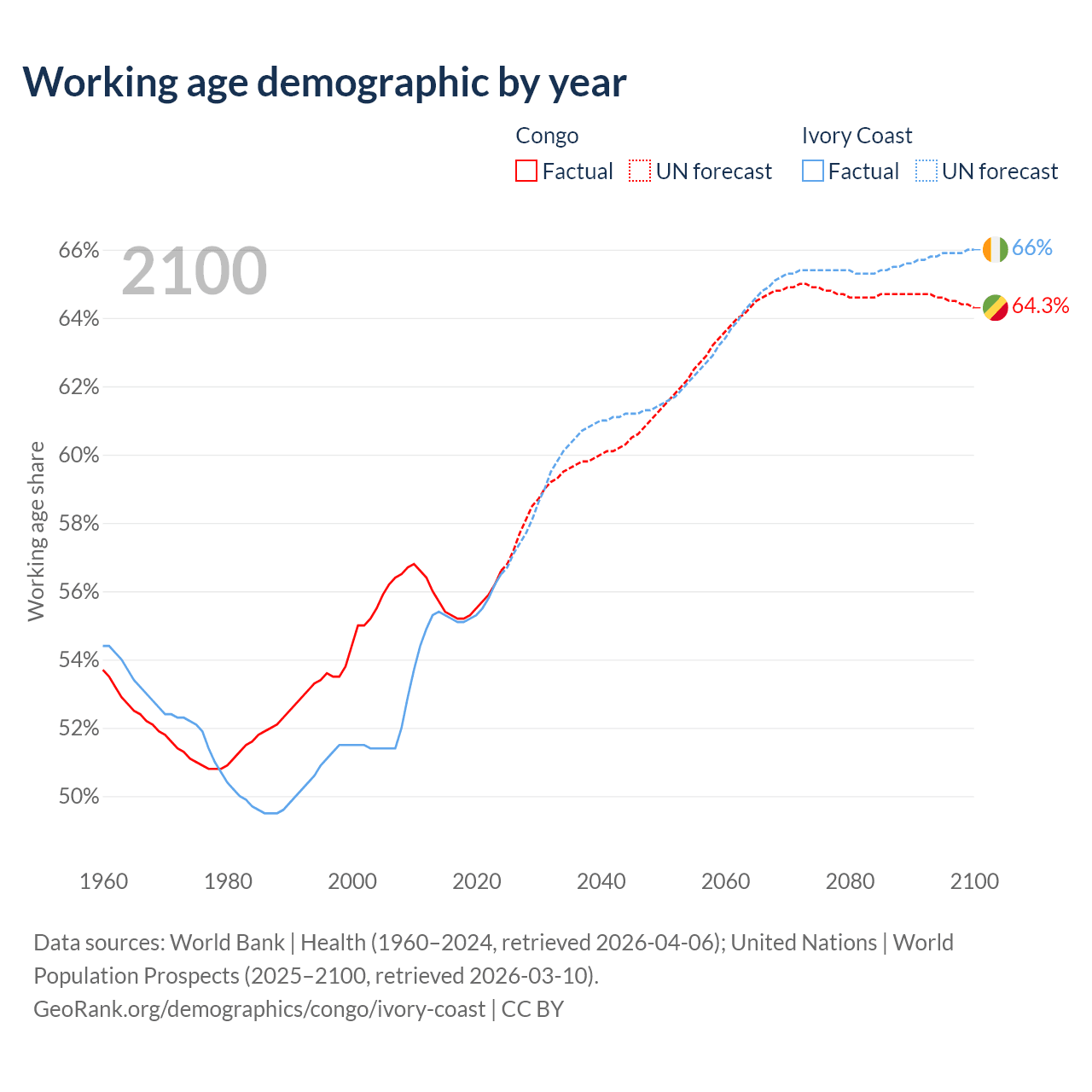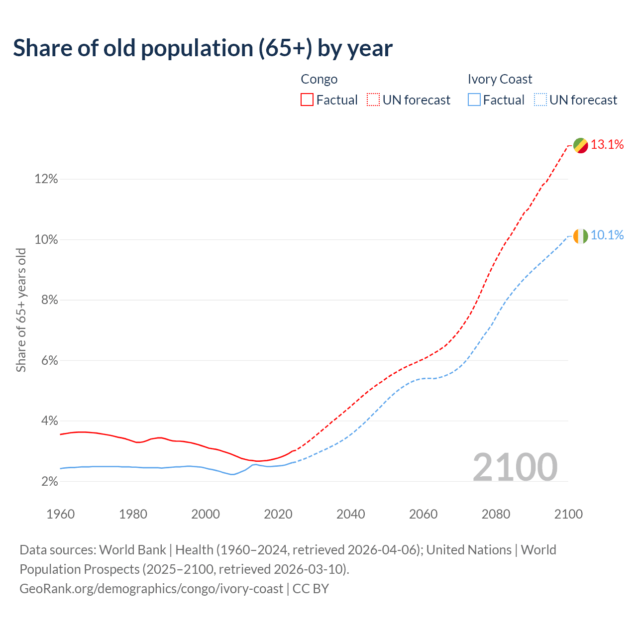 The share of older people aged 65 and over is 2.99% in the Congo and 2.61% in Ivory Coast. Life expectancy in the Congo compared to Ivory Coast .