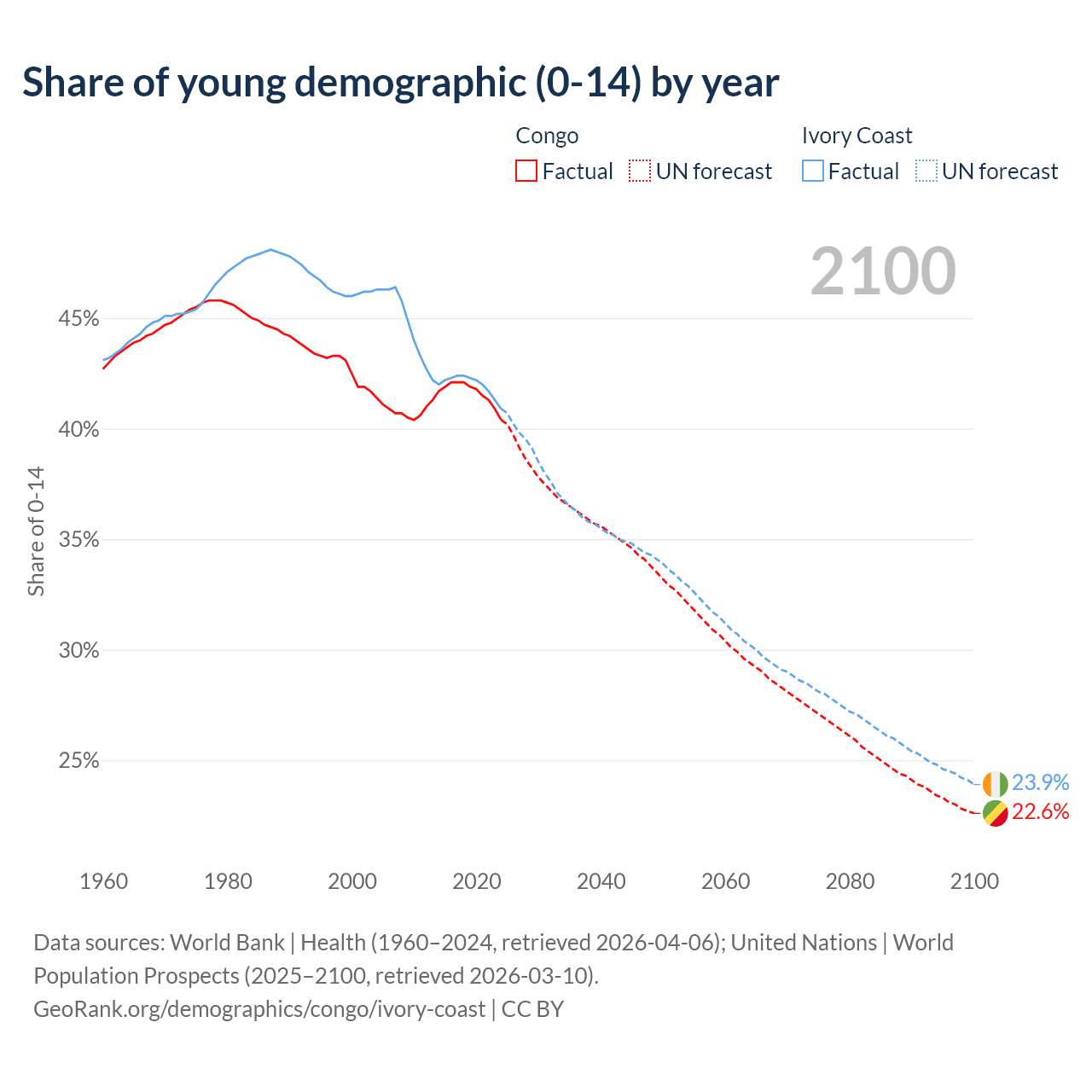- The share of young demographic (0-15 years old) in the Congo is 40.4% vs 40.9% in Ivory Coast.