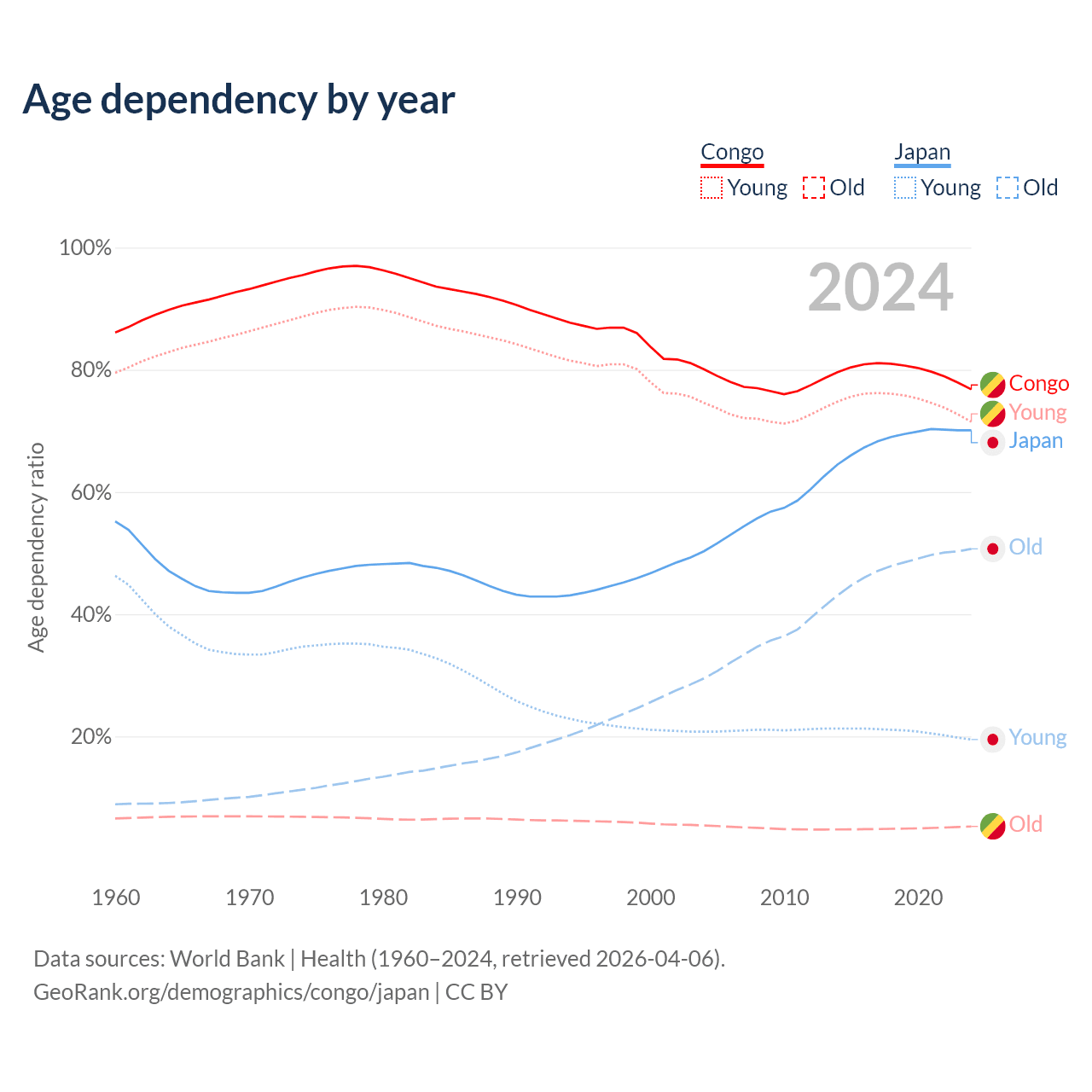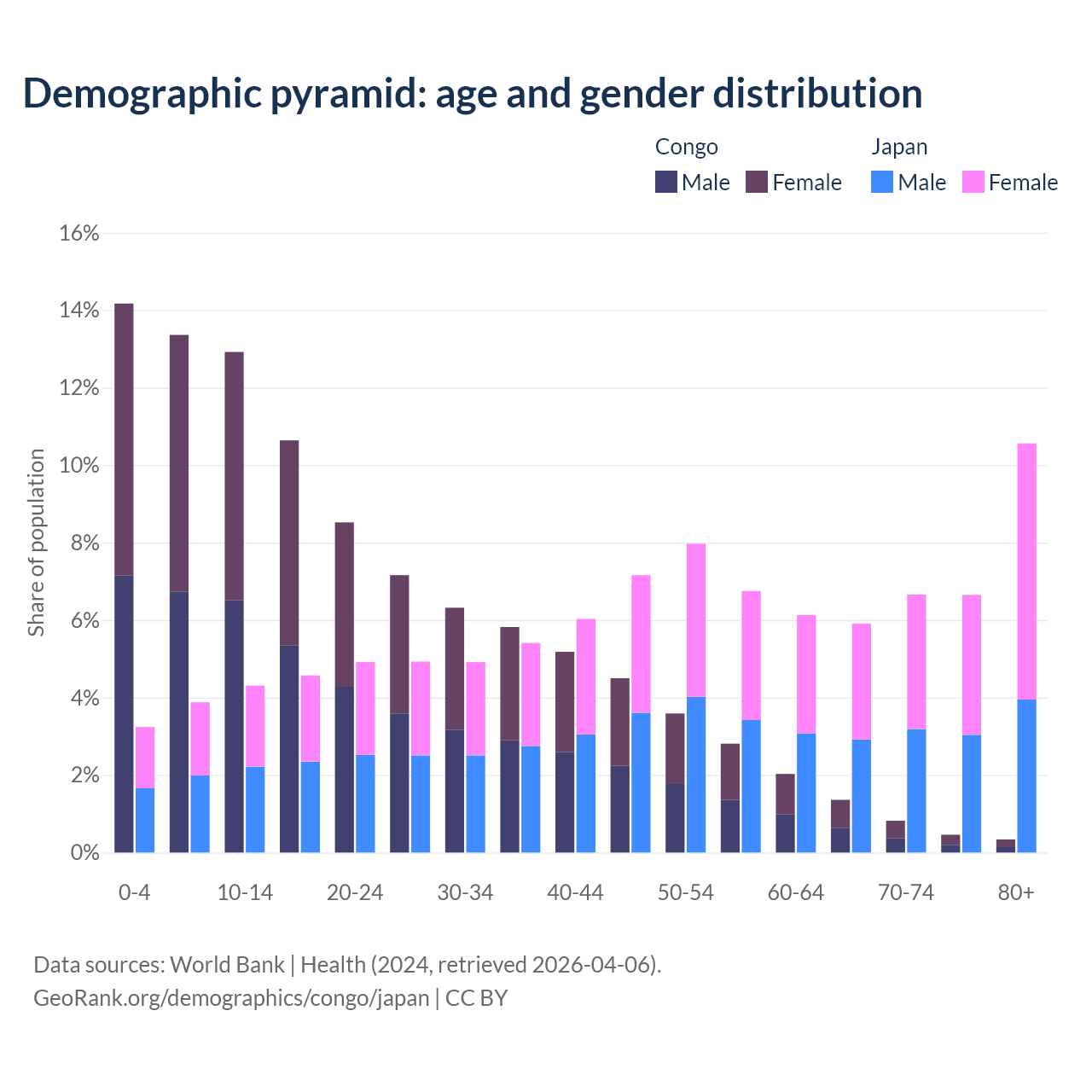 - The Congo is ranked 170/196 by median age (oldest to youngest) vs 2/196 for Japan.