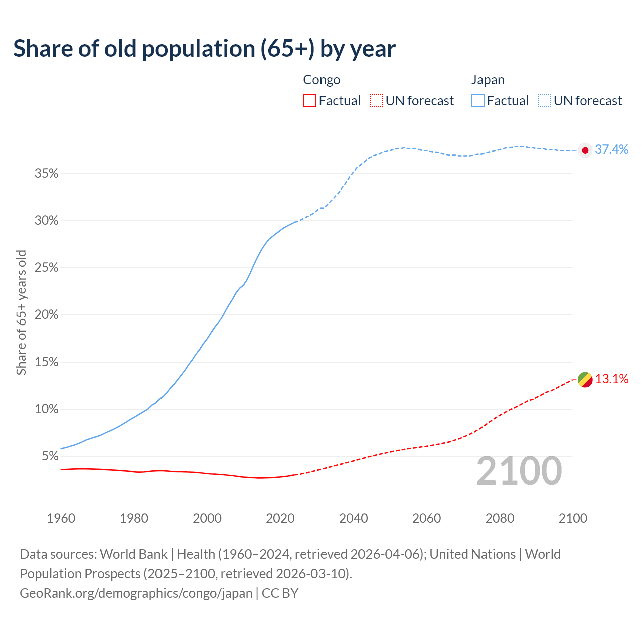 - The share of old-age demographic (65+) in the Congo is 2.99% vs 29.8% in Japan.