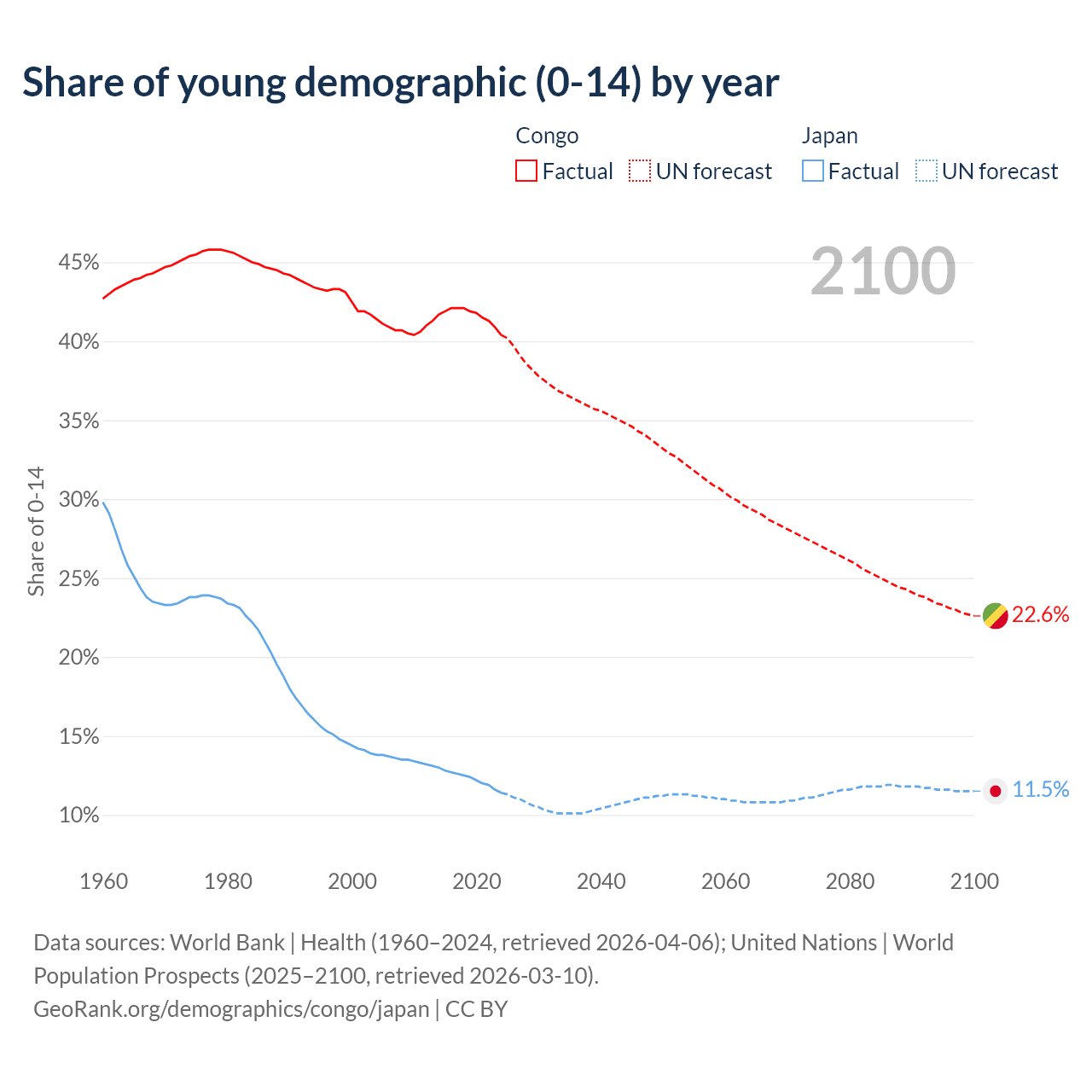 - The share of young demographic (0-15 years old) in the Congo is 40.4% vs 11.4% in Japan.