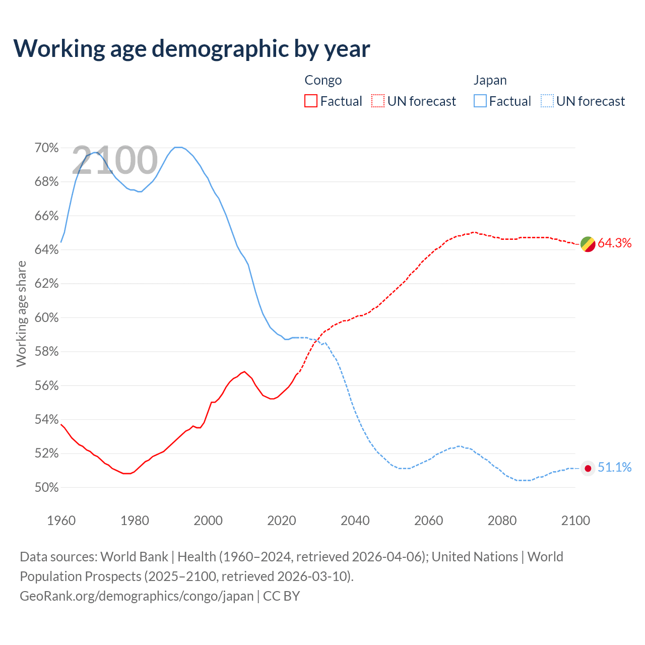 - The Congo has 3.78M working age adults (aged 15-64) vs 72.1M in Japan.