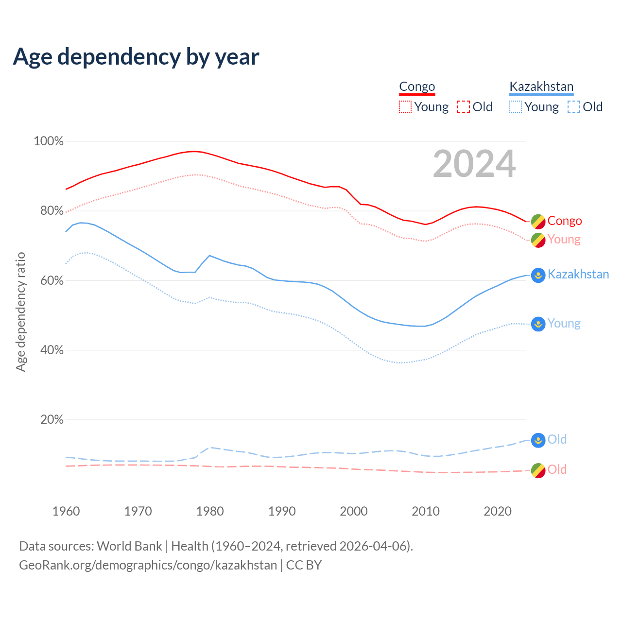 Data sources: World Bank | Health (1960–2024, retrieved 2026-04-06); U.S. Census Bureau (1960–2024, retrieved 2026-02-08).