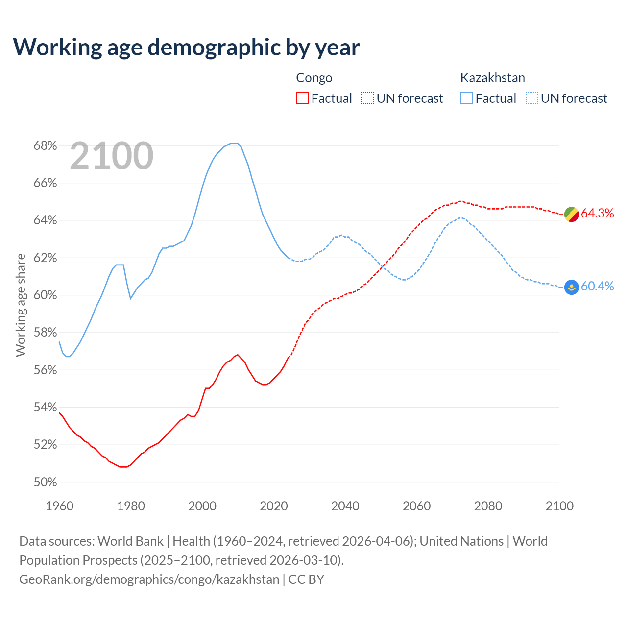 Median age Congo vs Kazakhstan, 1960-2100
