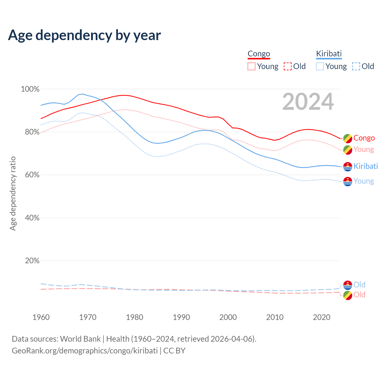 - The share of old-age demographic (65+) in the Congo is 2.99% vs 4.24% in Kiribati.