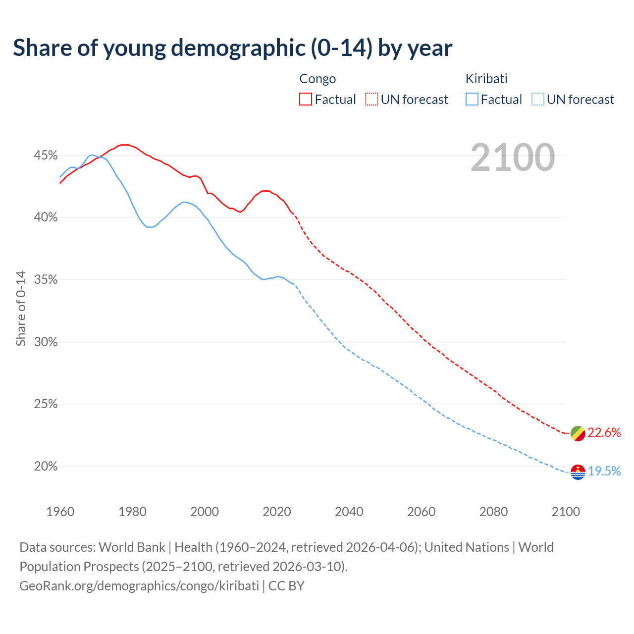 - The share of young demographic (0-15 years old) in the Congo is 40.4% vs 34.7% in Kiribati.