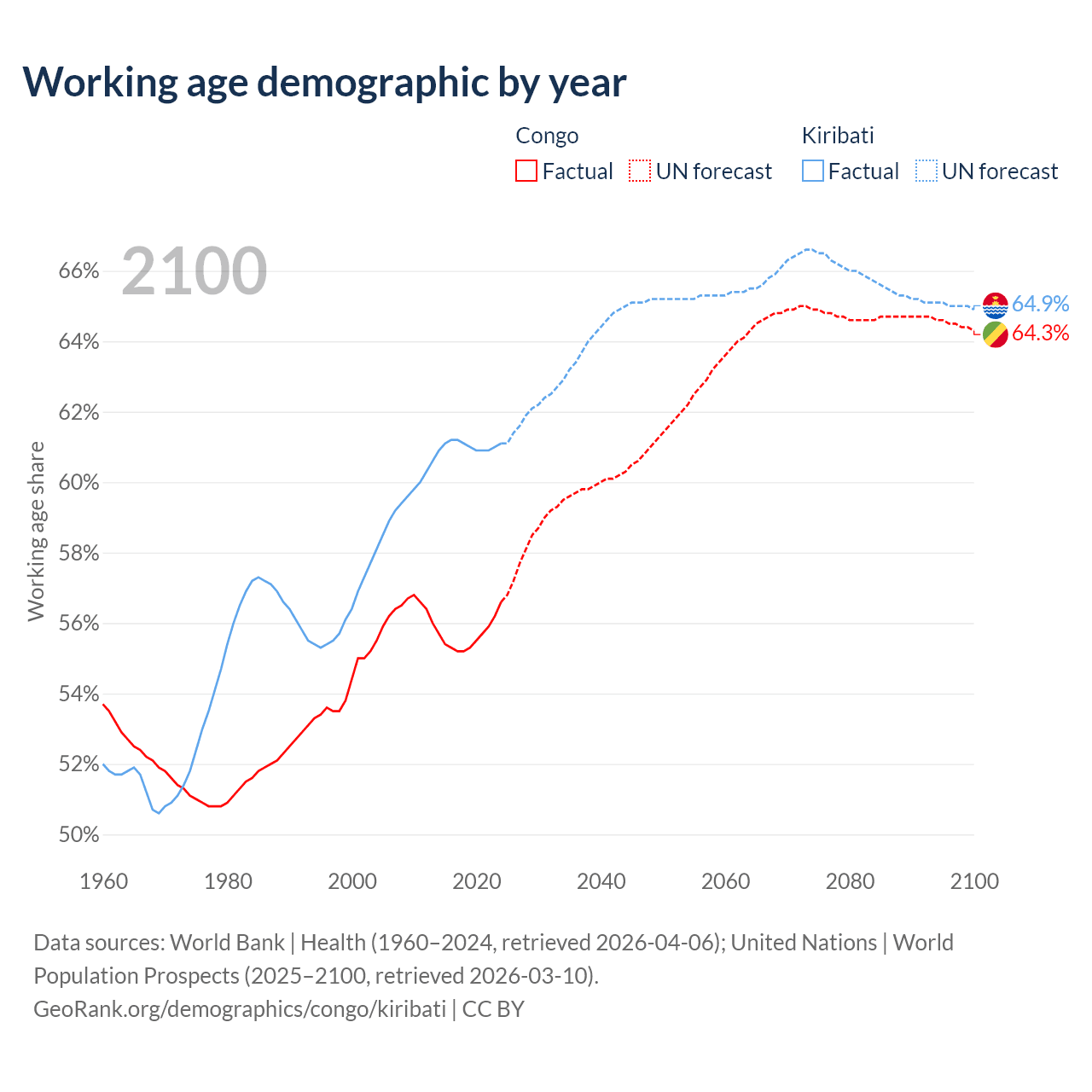 - The Congo has 3.78M working age adults (aged 15-64) vs 84.9K in Kiribati.