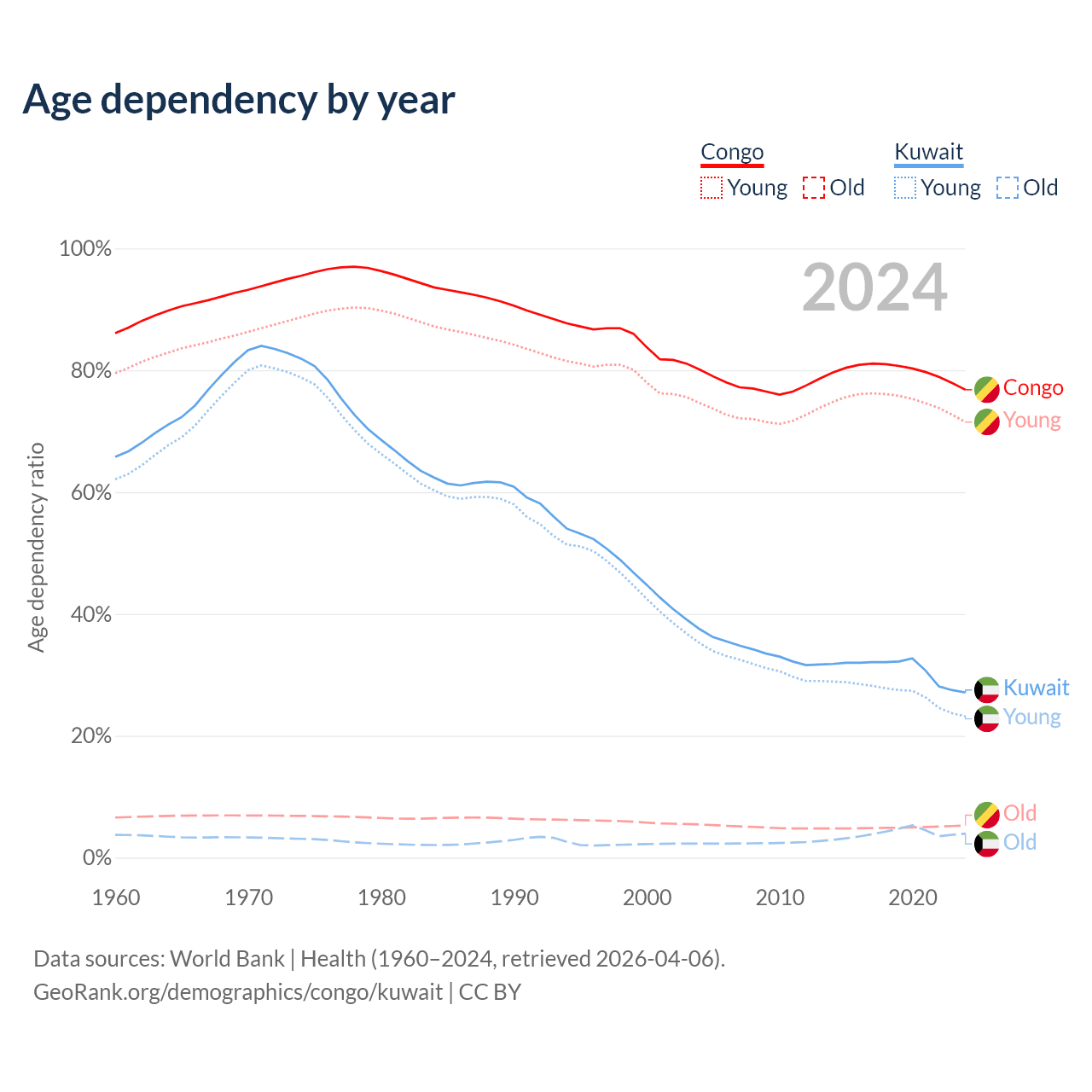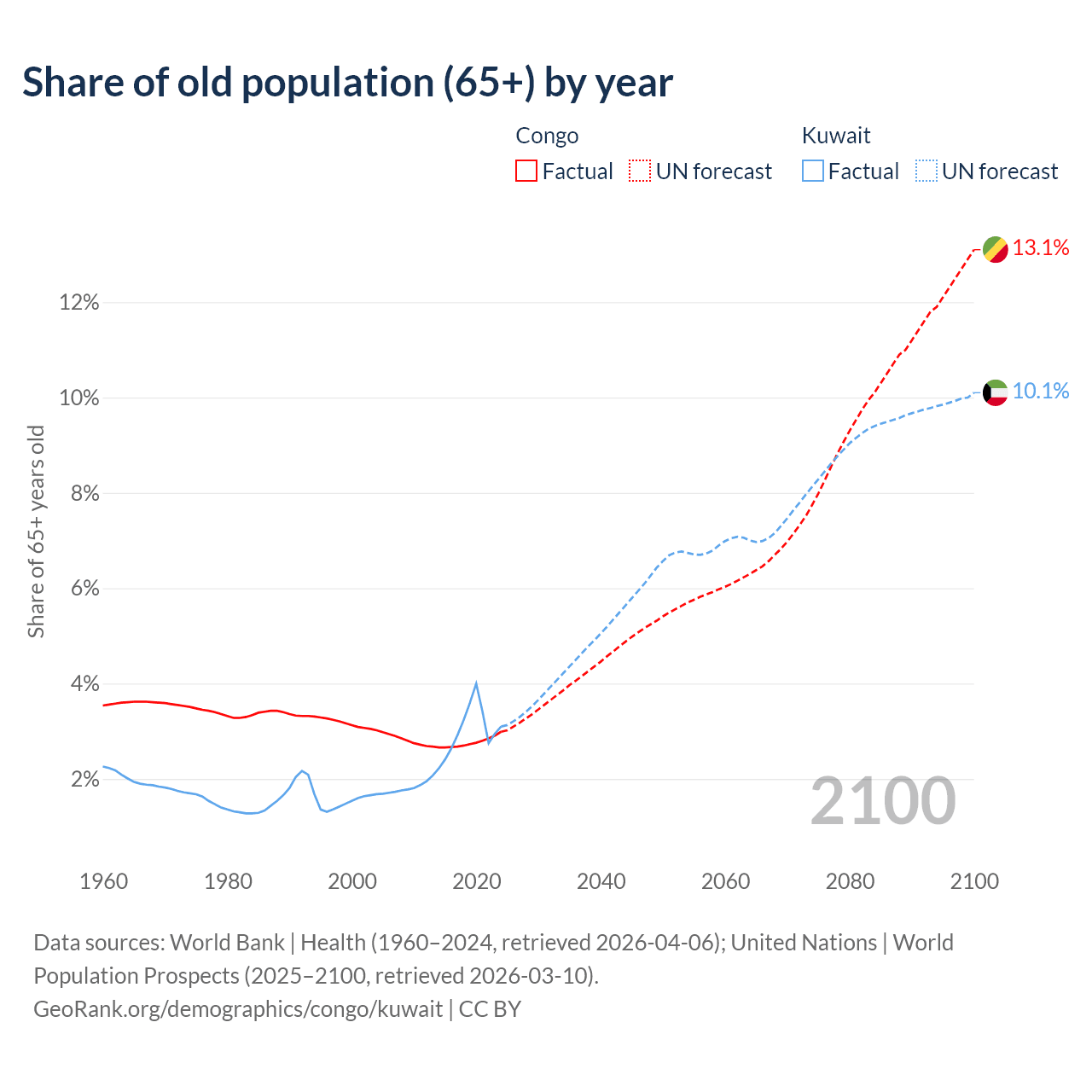 The share of older people aged 65 and over is 2.99% in the Congo and 3.1% in Kuwait. Life expectancy in the Congo compared to Kuwait .