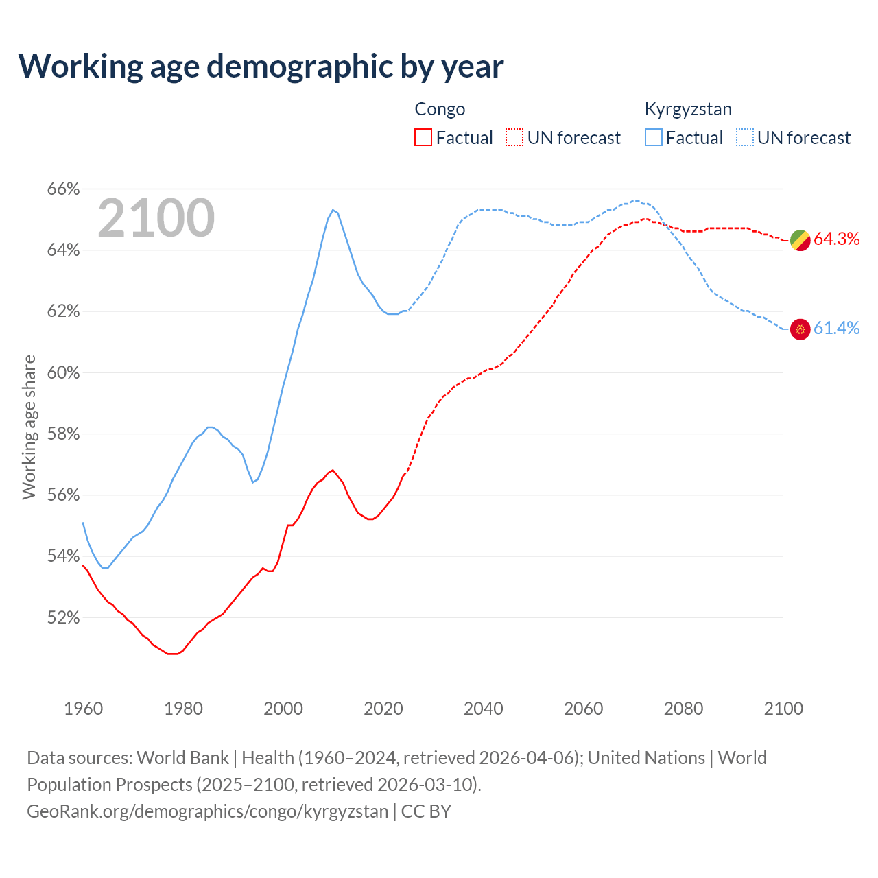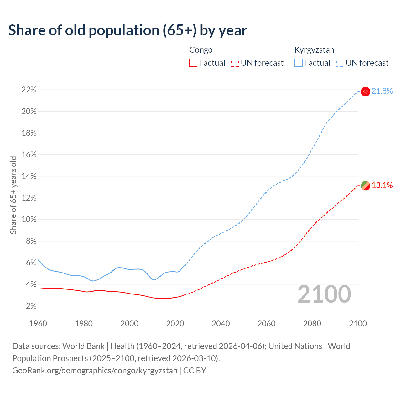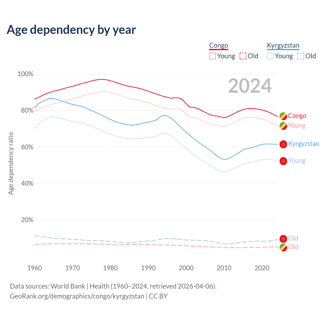 - The share of old-age demographic (65+) in the Congo is 2.99% vs 5.68% in Kyrgyzstan.