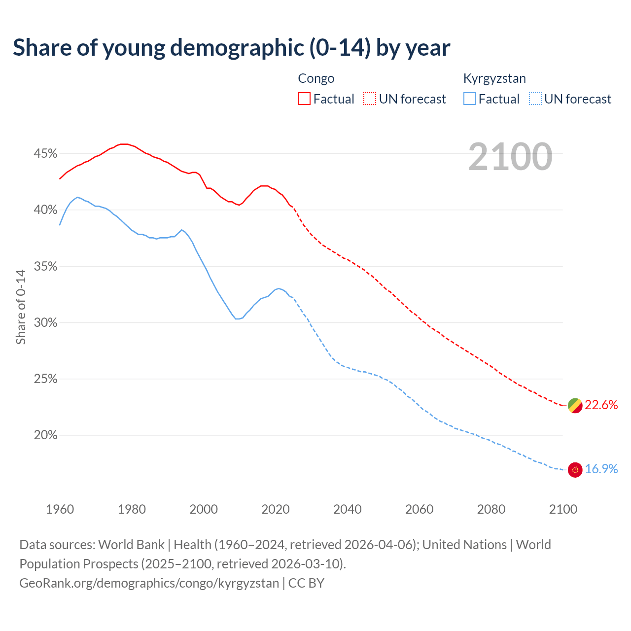 - The share of young demographic (0-15 years old) in the Congo is 40.4% vs 32.3% in Kyrgyzstan.