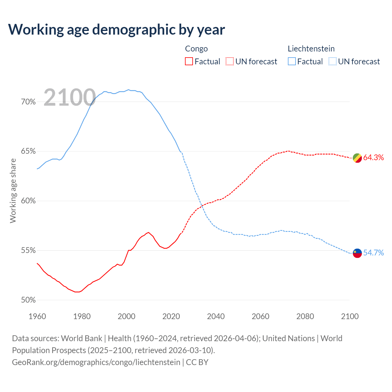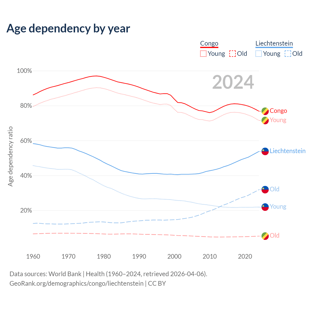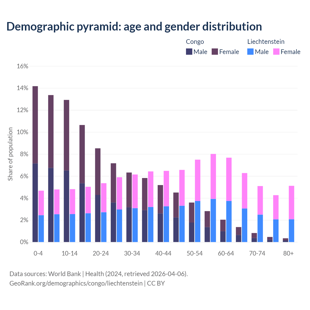 - The share of old-age demographic (65+) in the Congo is 2.99% vs 20.7% in Liechtenstein.