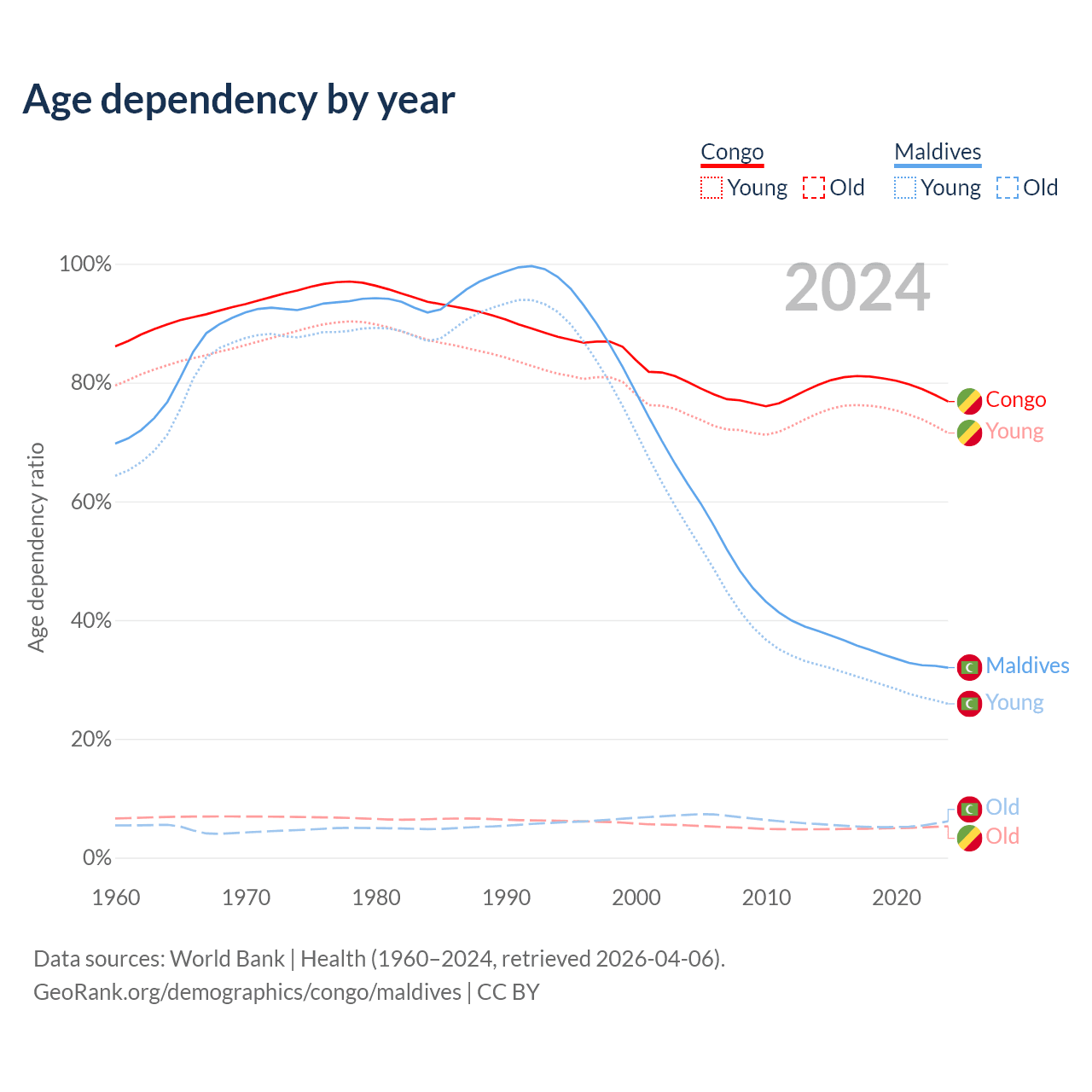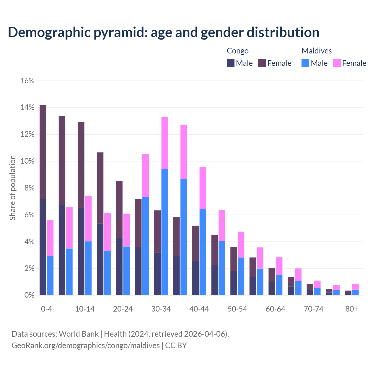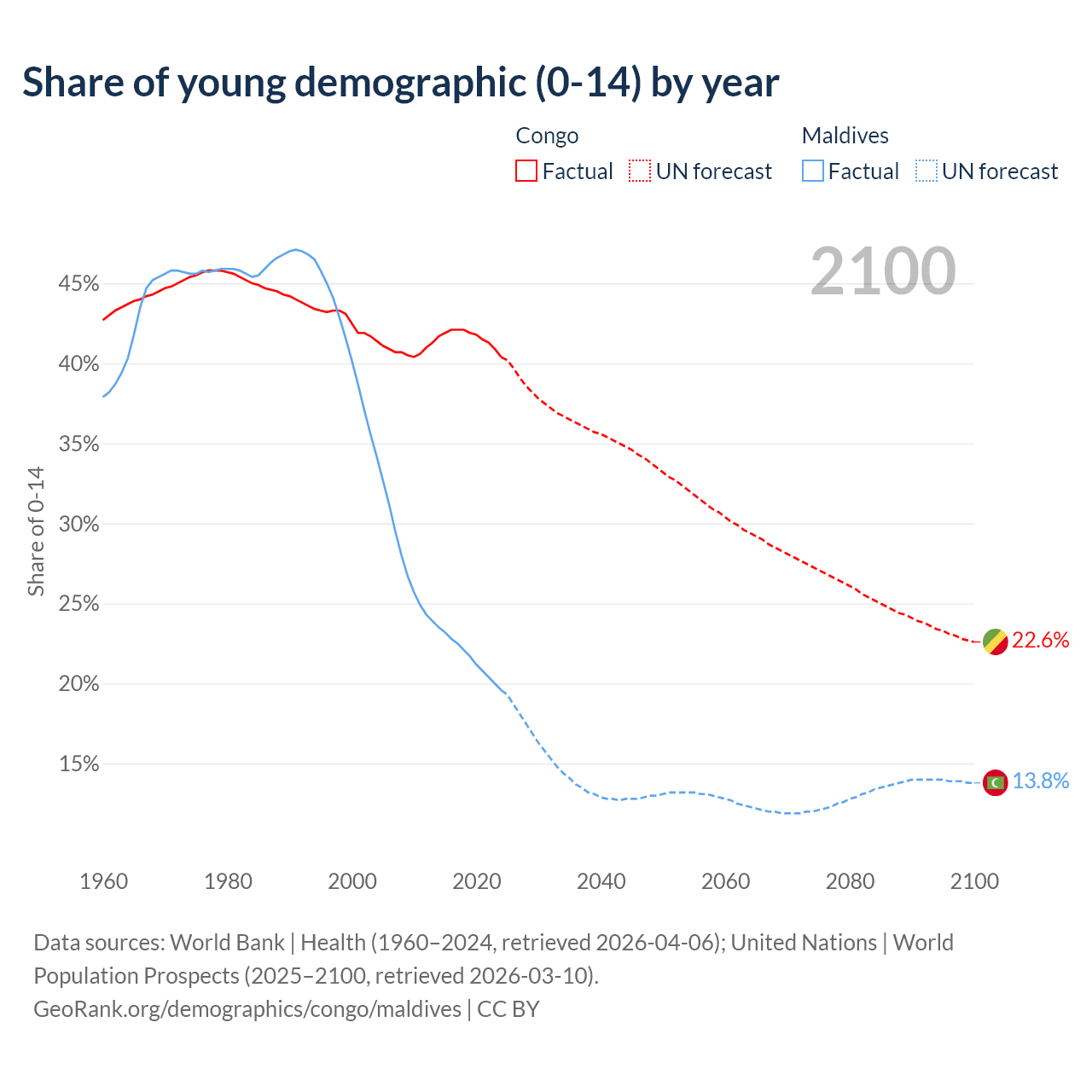 - The share of young demographic (0-15 years old) in the Congo is 40.4% vs 19.6% in Maldives.