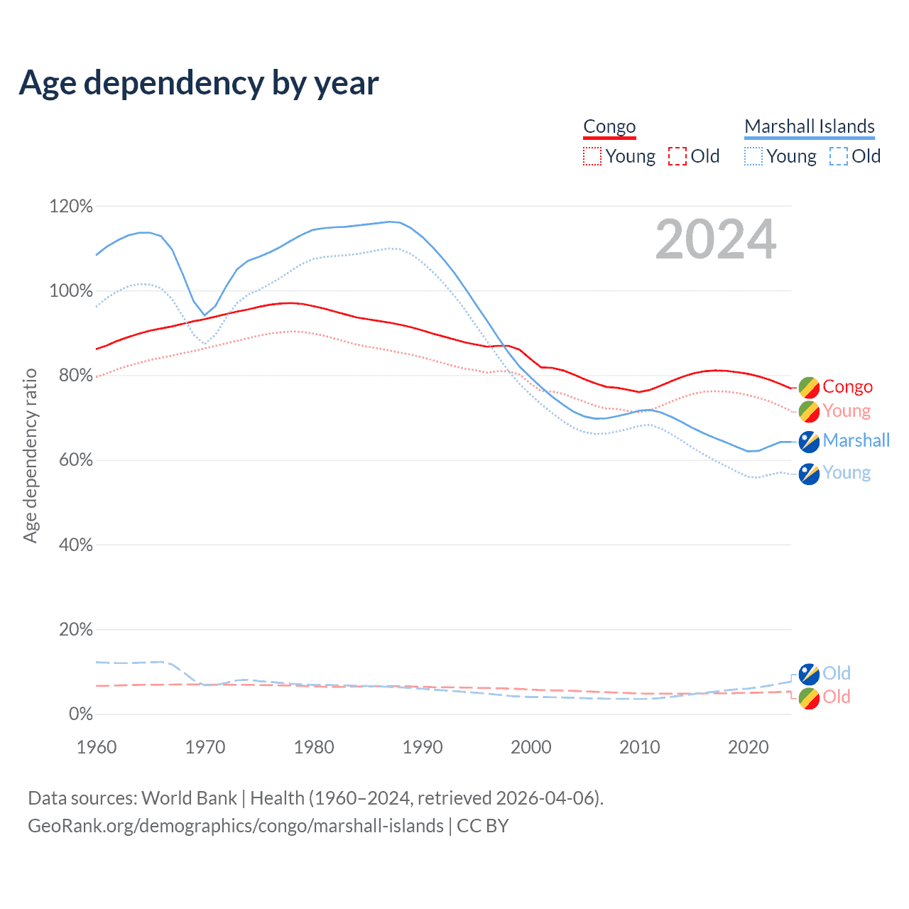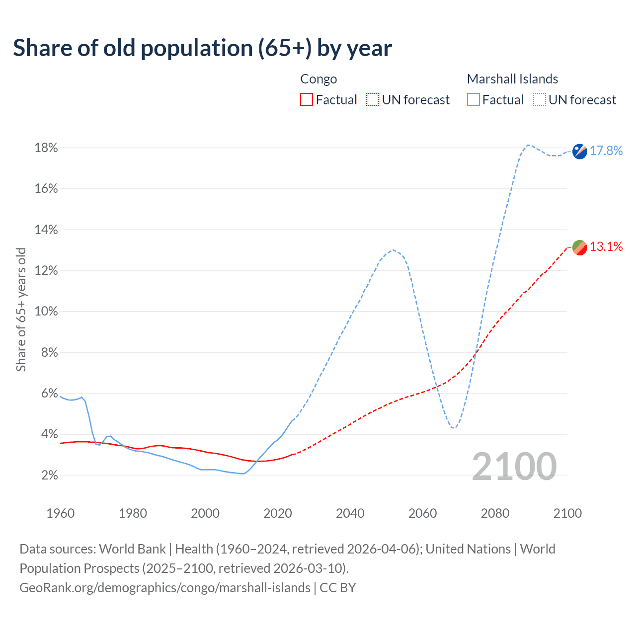 - The share of old-age demographic (65+) in the Congo is 2.99% vs 4.64% in the Marshall Islands.