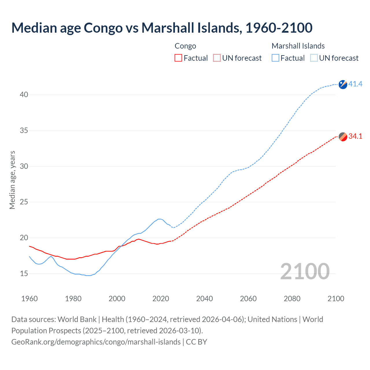 - The Congo is ranked 170/196 by median age (oldest to youngest) vs 150/196 for the Marshall Islands.