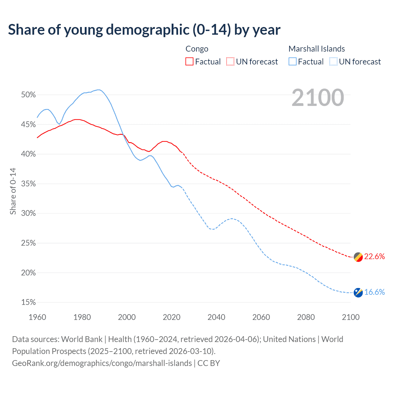 - The share of young demographic (0-15 years old) in the Congo is 40.4% vs 34.5% in the Marshall Islands.