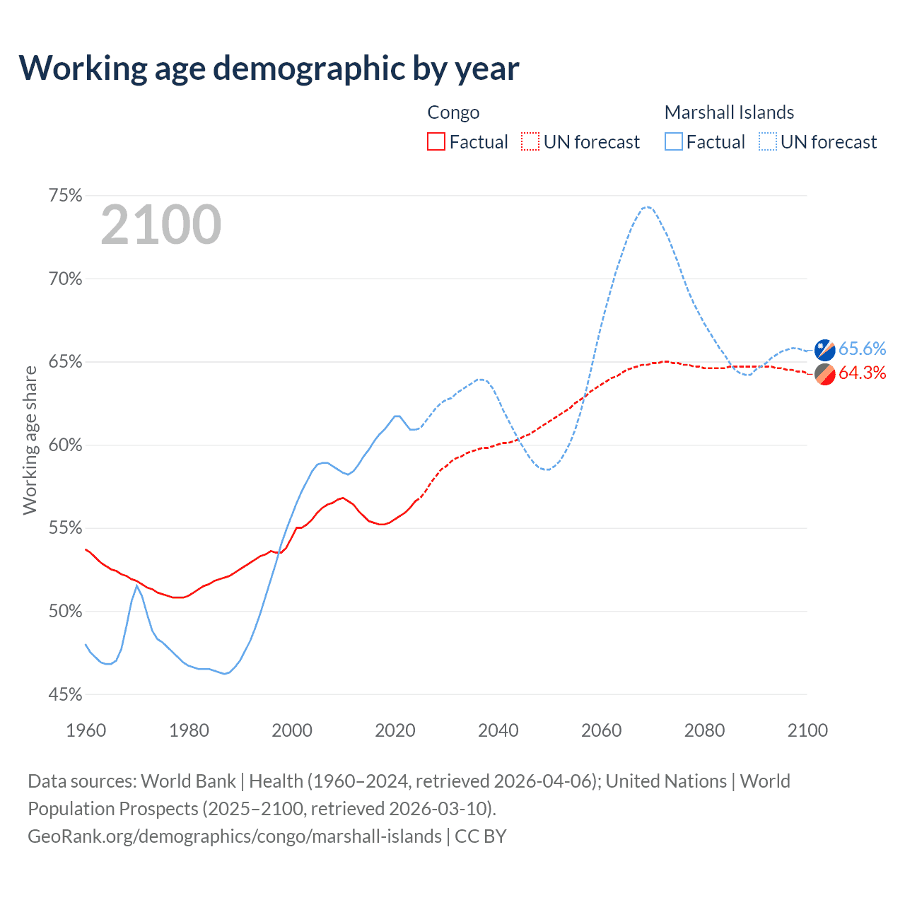 - The Congo has 3.78M working age adults (aged 15-64) vs 21.3K in the Marshall Islands.