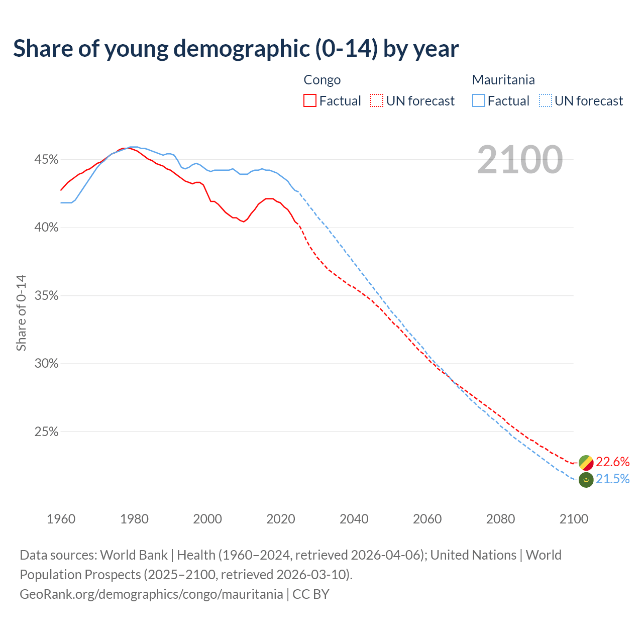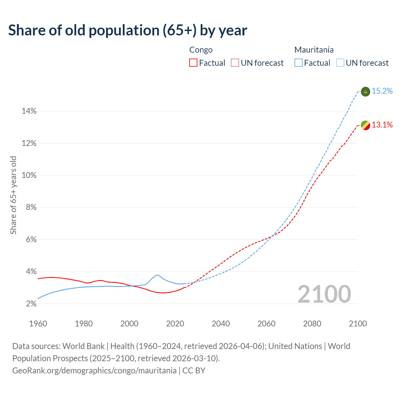 - The share of old-age demographic (65+) in the Congo is 2.99% vs 3.23% in Mauritania.