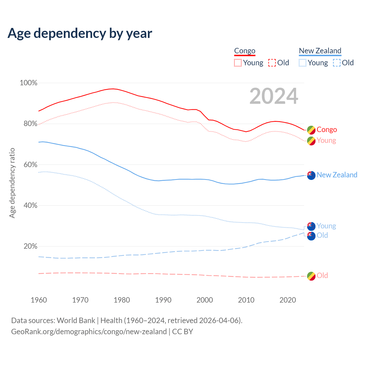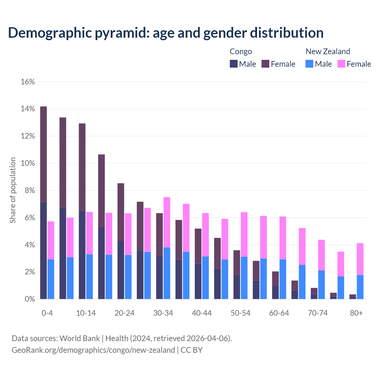 - The share of old-age demographic (65+) in the Congo is 2.99% vs 17.2% in New Zealand.