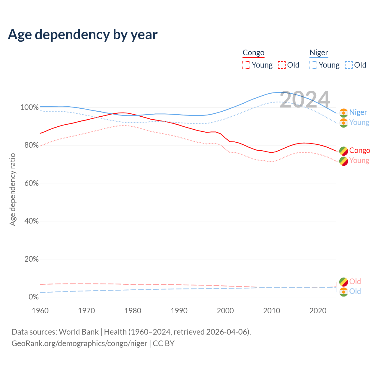 - The share of old-age demographic (65+) in the Congo is 2.99% vs 2.59% in Niger.