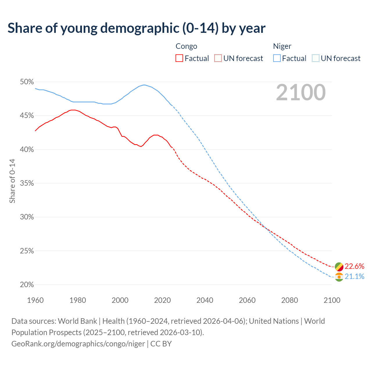- The share of young demographic (0-15 years old) in the Congo is 40.4% vs 46.6% in Niger.