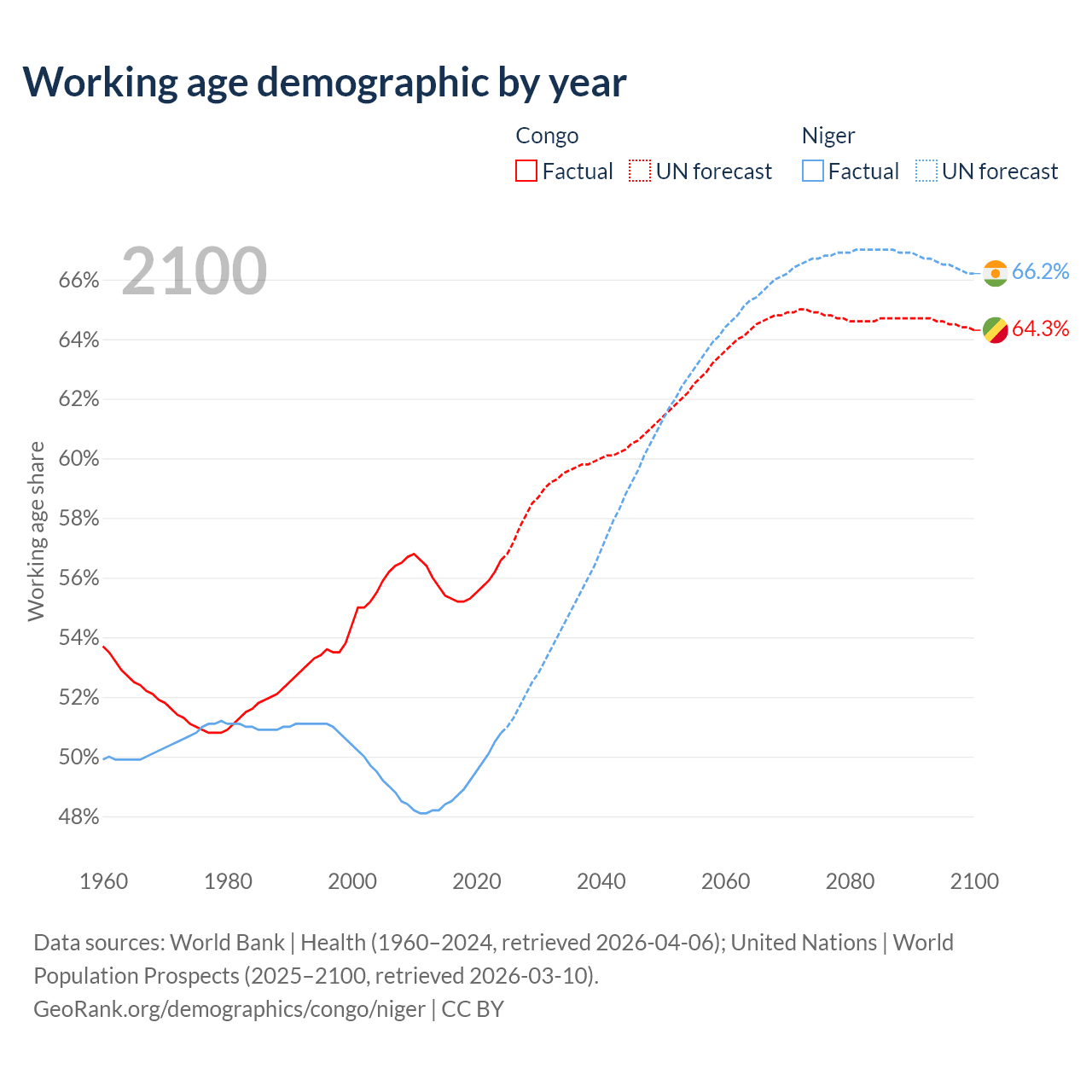- The Congo has 3.78M working age adults (aged 15-64) vs 14.8M in Niger.