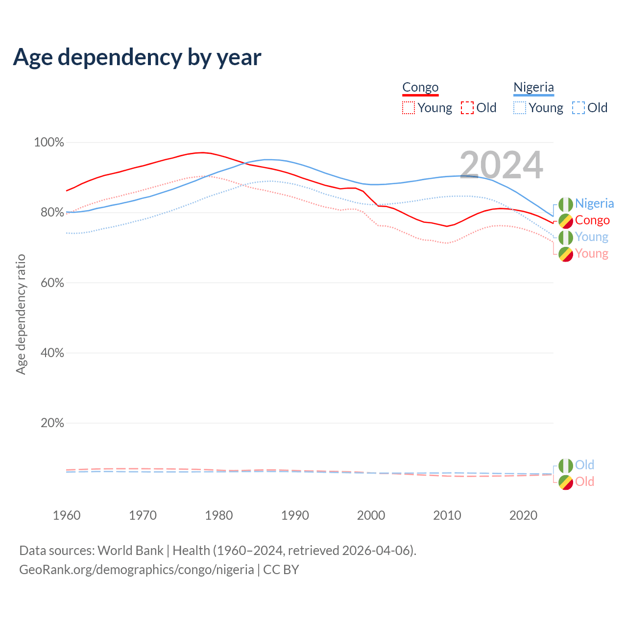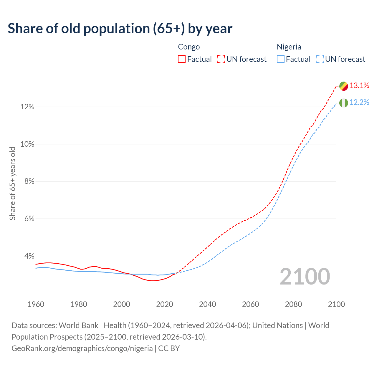 - The share of old-age demographic (65+) in the Congo is 2.99% vs 3.05% in Nigeria.