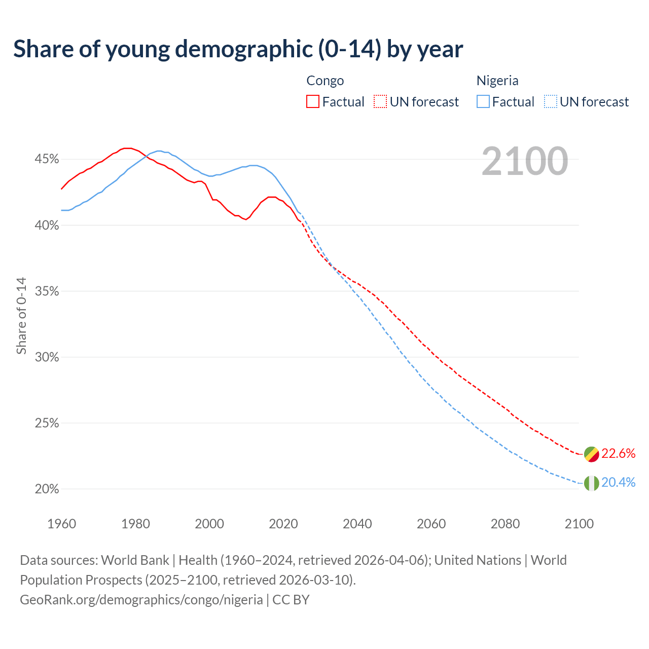 - The share of young demographic (0-15 years old) in the Congo is 40.4% vs 41% in Nigeria.