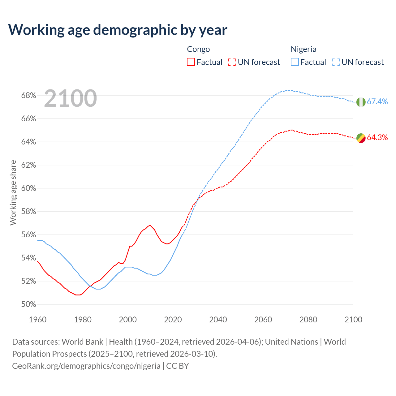 - The Congo has 3.78M working age adults (aged 15-64) vs 136M in Nigeria.