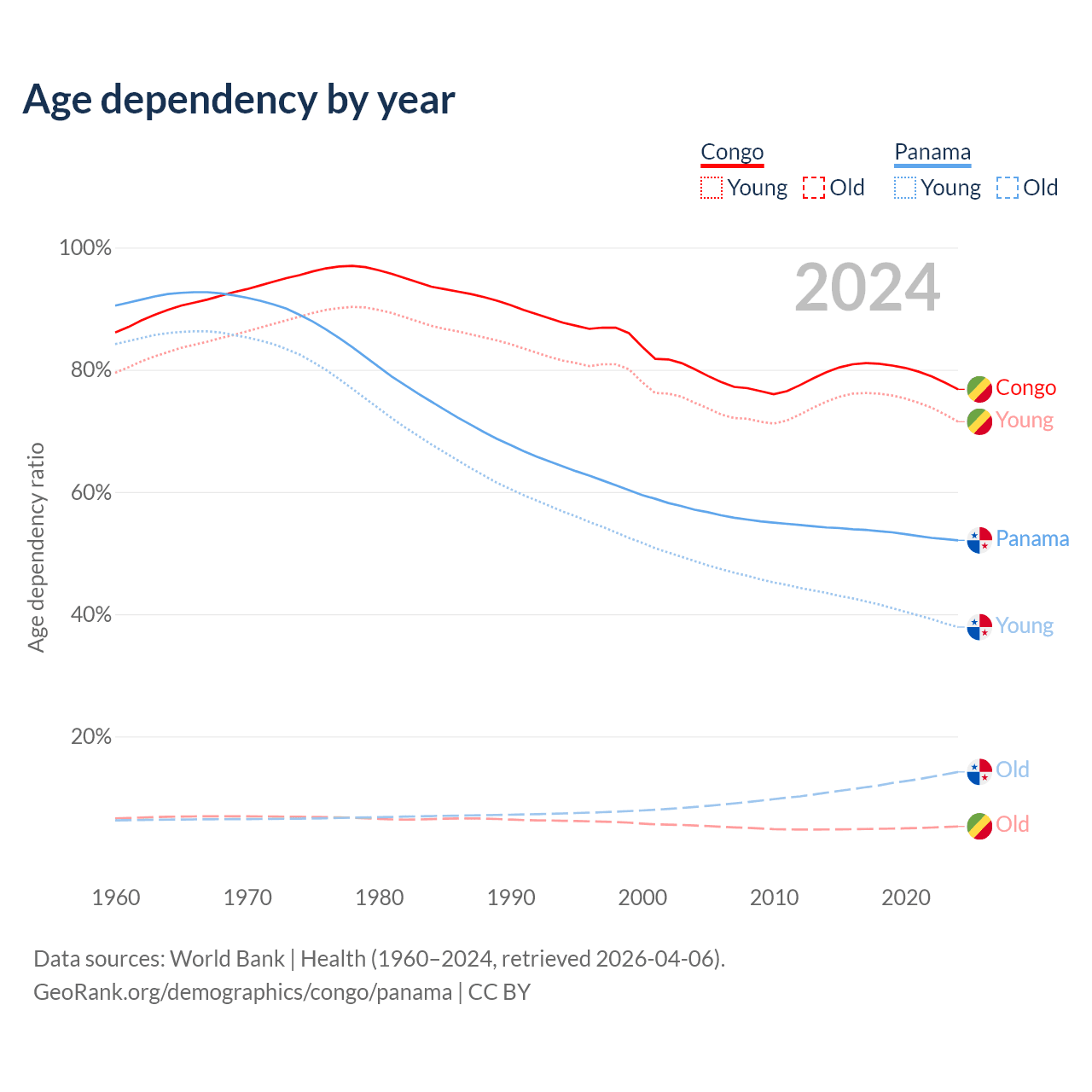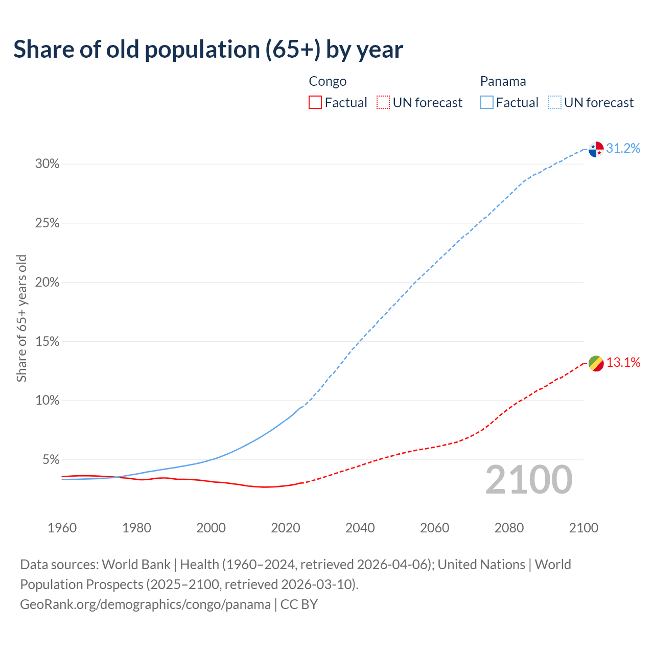 - The share of old-age demographic (65+) in the Congo is 2.99% vs 9.35% in Panama.