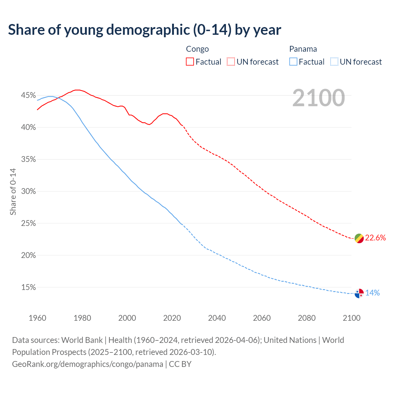 - The share of young demographic (0-15 years old) in the Congo is 40.4% vs 24.9% in Panama.