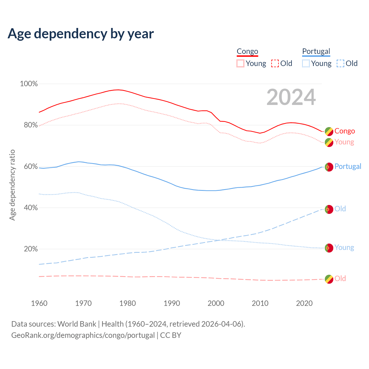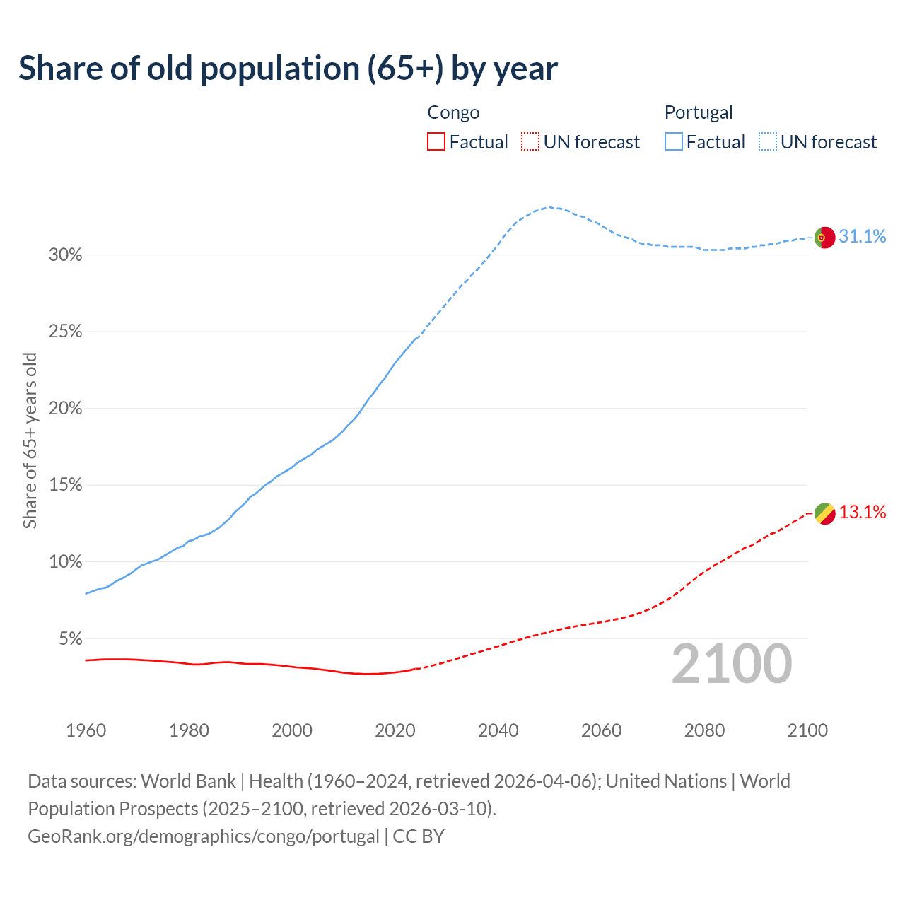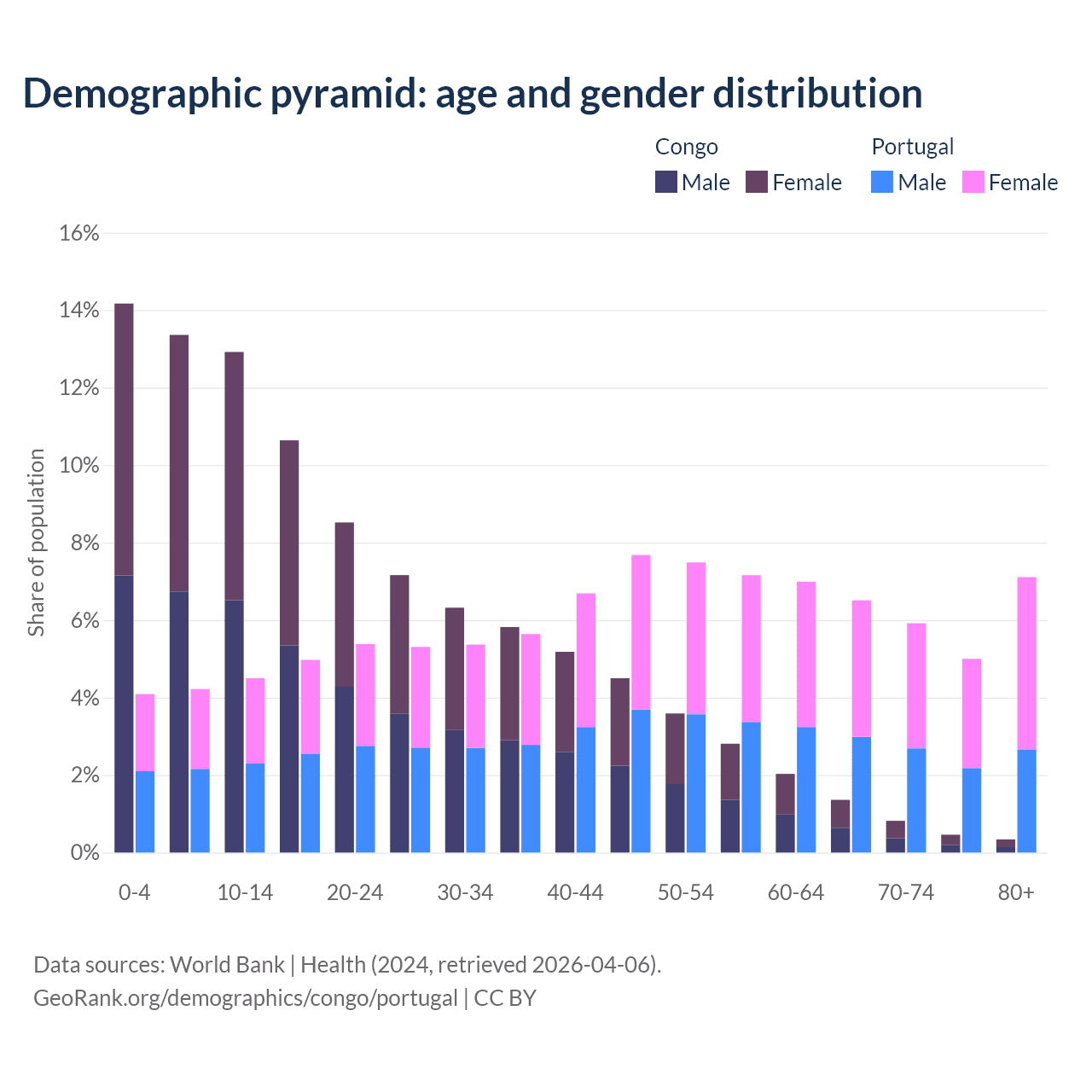 - The share of old-age demographic (65+) in the Congo is 2.99% vs 24.5% in Portugal.