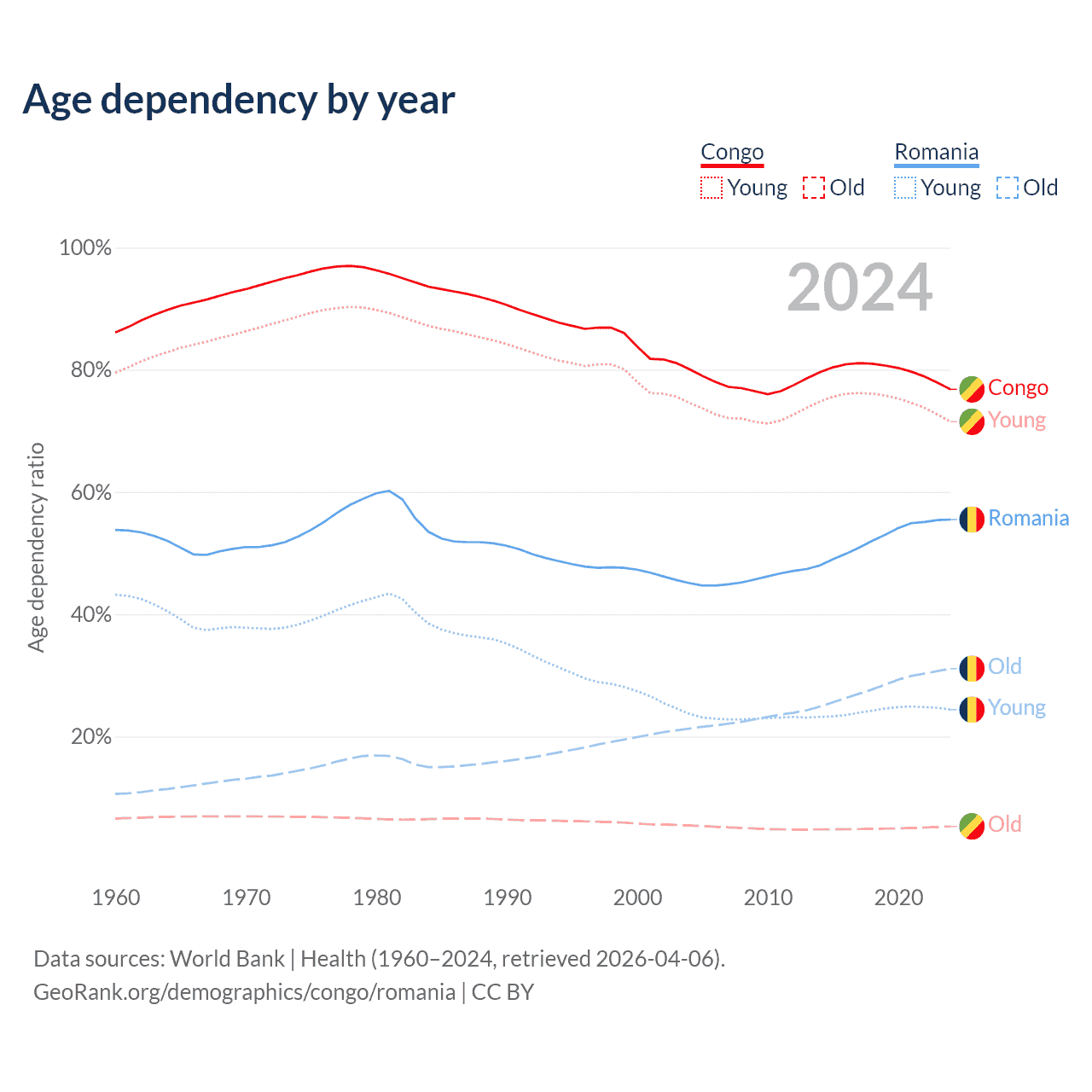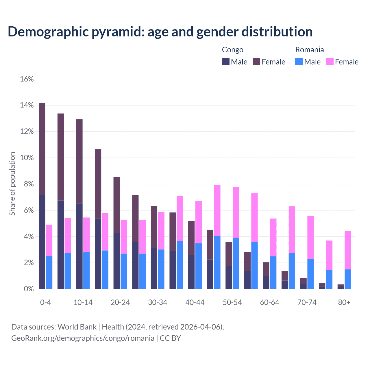 The share of older people aged 65 and over is 2.99% in the Congo and 20% in Romania. Life expectancy in the Congo compared to Romania .