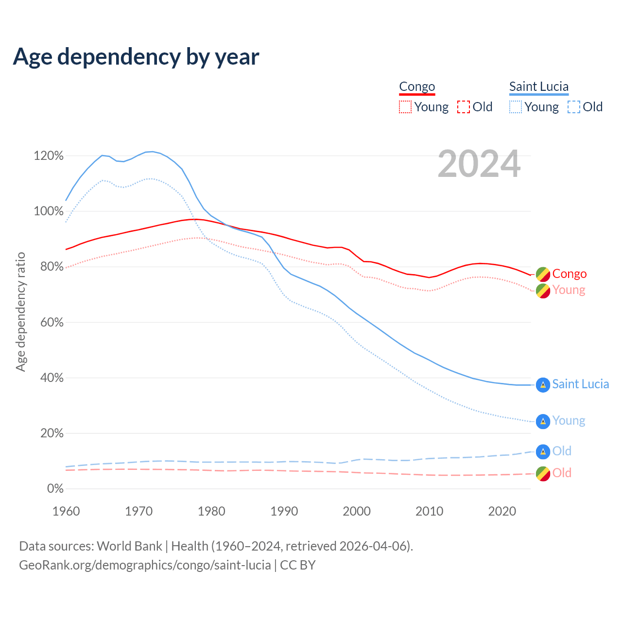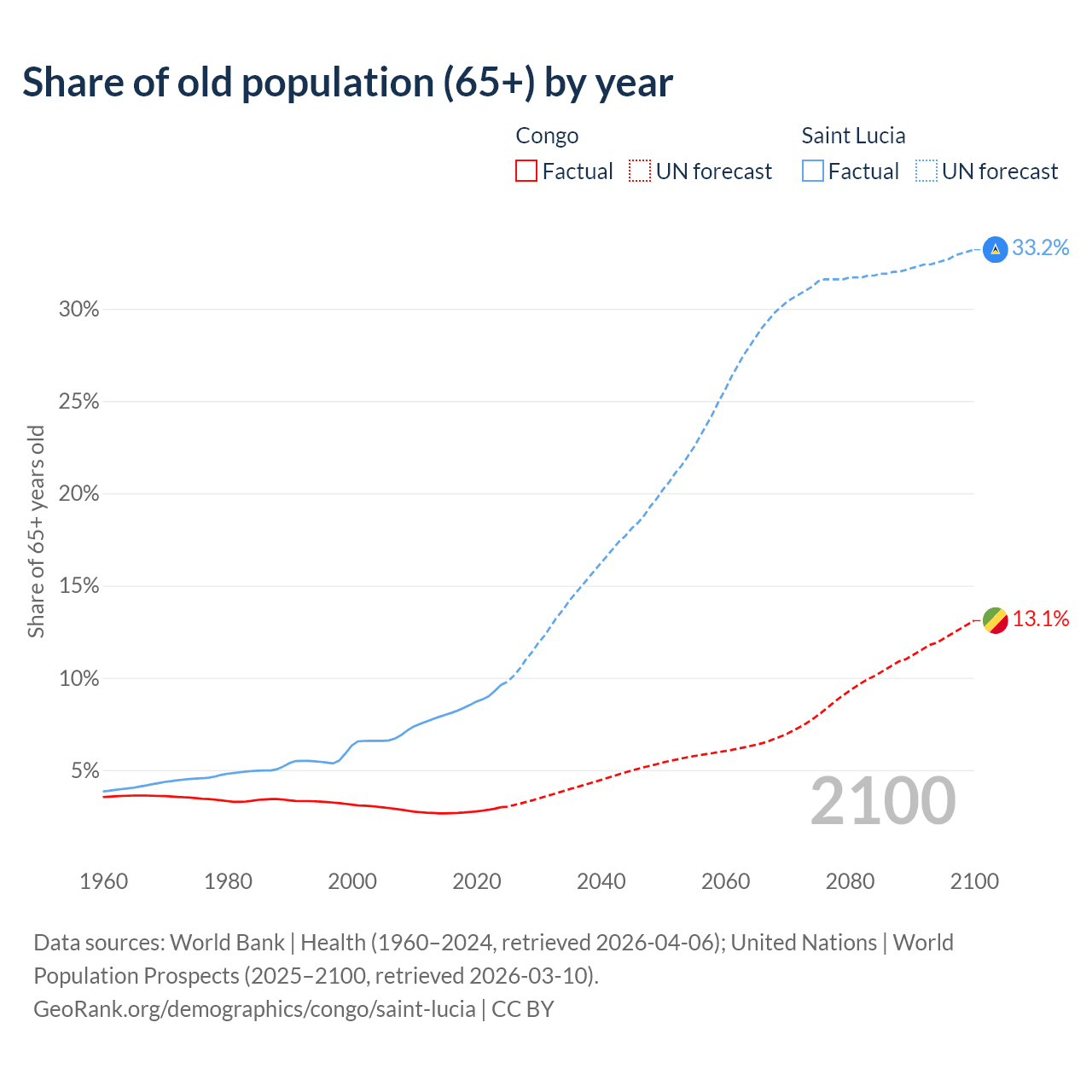 - The share of old-age demographic (65+) in the Congo is 2.99% vs 9.62% in Saint Lucia.