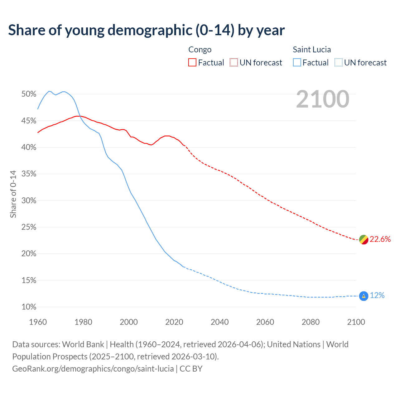 - The share of young demographic (0-15 years old) in the Congo is 40.4% vs 17.5% in Saint Lucia.