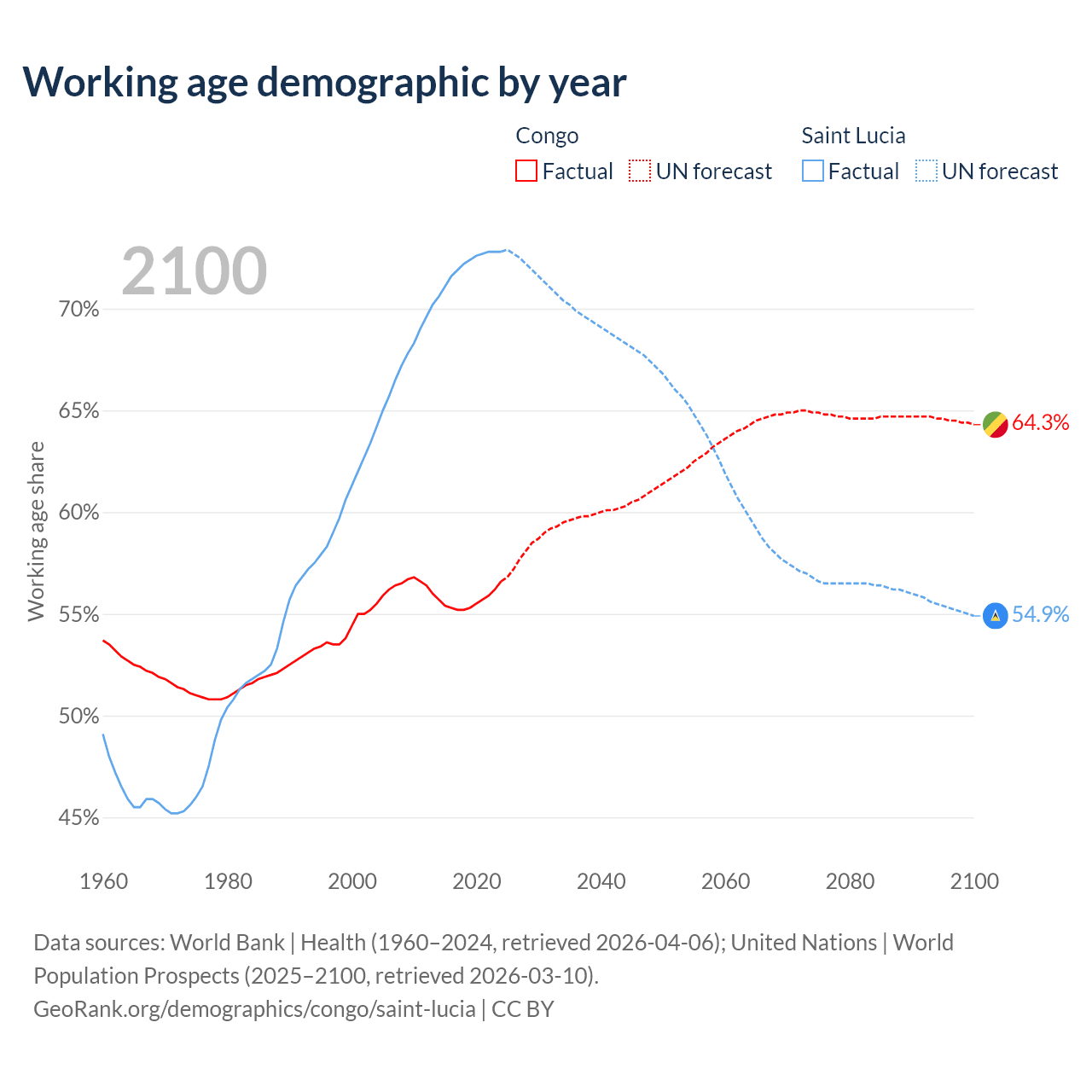 - The Congo has 3.78M working age adults (aged 15-64) vs 132K in Saint Lucia.