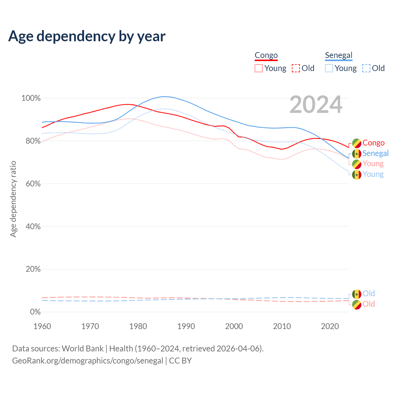 - The share of old-age demographic (65+) in the Congo is 2.99% vs 3.62% in Senegal.